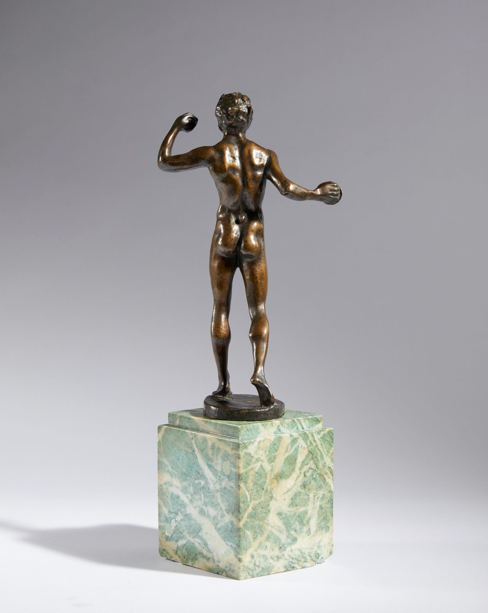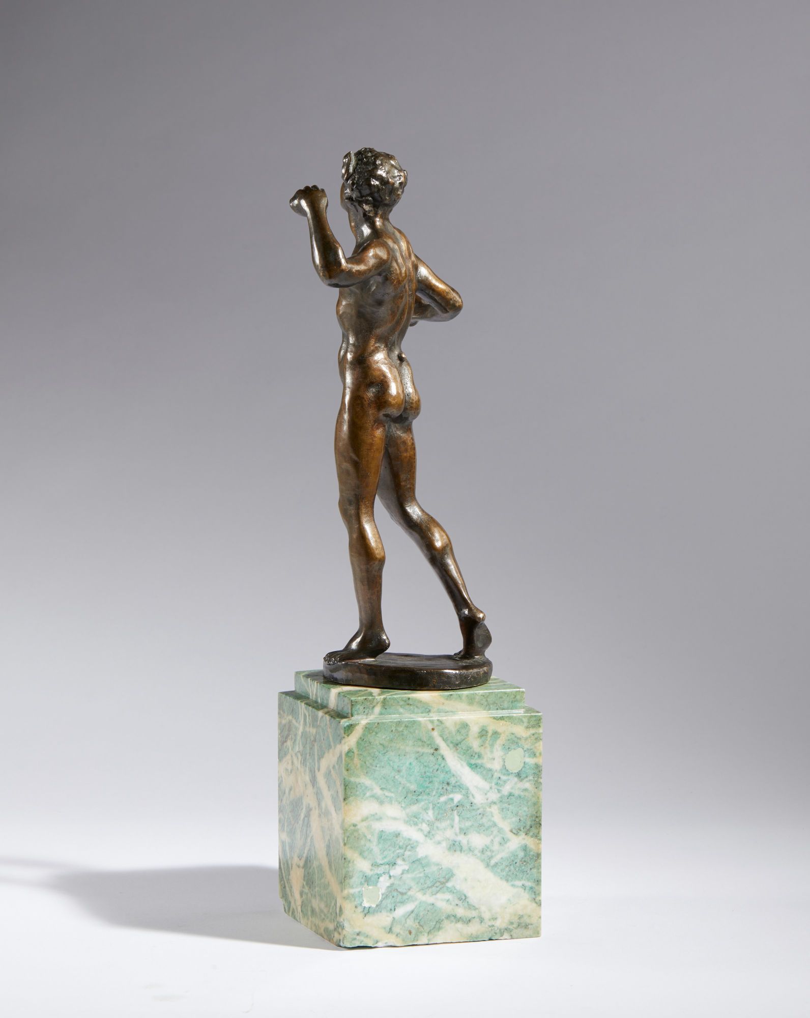 Pietro Simoni da Barga fu scultore di corte del cardinale Ferdinando de' Medici e realizzò per la sua prestigiosa committenza una serie di sculture in bronzo, spesso ispirate a originali archeologici e non solo. Circa una trentina delle sue opere sono oggi conservate al Museo Nazionale del Bargello a Firenze. Questi bronzetti presentano generalmente una pattina intensa, spesso arricchita da tracce verdognole, imitazione della patina archeologica. Nel Rinascimento, infatti, si tendeva ad emulare le opere antiche al punto di confondersi con esse. Il nostro Satiro appartiene a questo gruppo conservato al Bargello. Presenta una patina verde con tracce di doratura a fuoco. Una copia mutila della mano sinistra è conosciuta nella Galleria Franchetti alla Ca' d'Oro, Venezia, mentre poche altre repliche si trovano in altri musei. L'originale risulta essere evidentemente la statuetta del Bargello, ma le altre copie, databili tra il XVII e XVIII secolo, rappresentano comunque derivazioni di pregio. La nostra in particolare presenta un modellato convincente e di guizzo, sostenuto da una splendida patina trasparente rossastra, tipica delle produzioni toscane antiche, su tracce più scure. Inoltre, il bronzo risulta tamburellato per creare più "movimento" sulla pelle della sculturina, caratteristica preziosa spesso rinvenuta sulle fusioni veramente antiche.