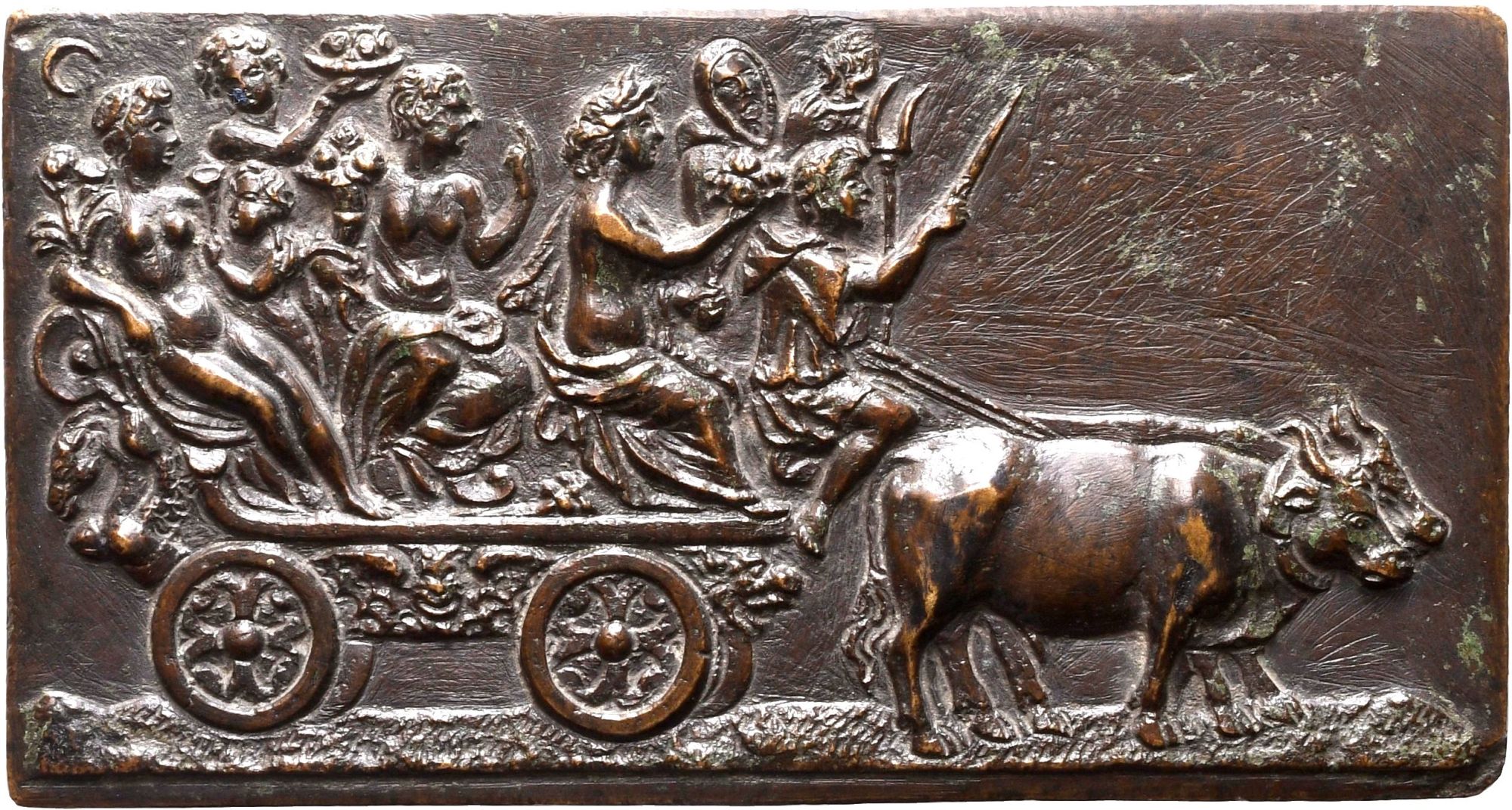 Placchetta rettangolare in bronzo, patina marrone scuro;