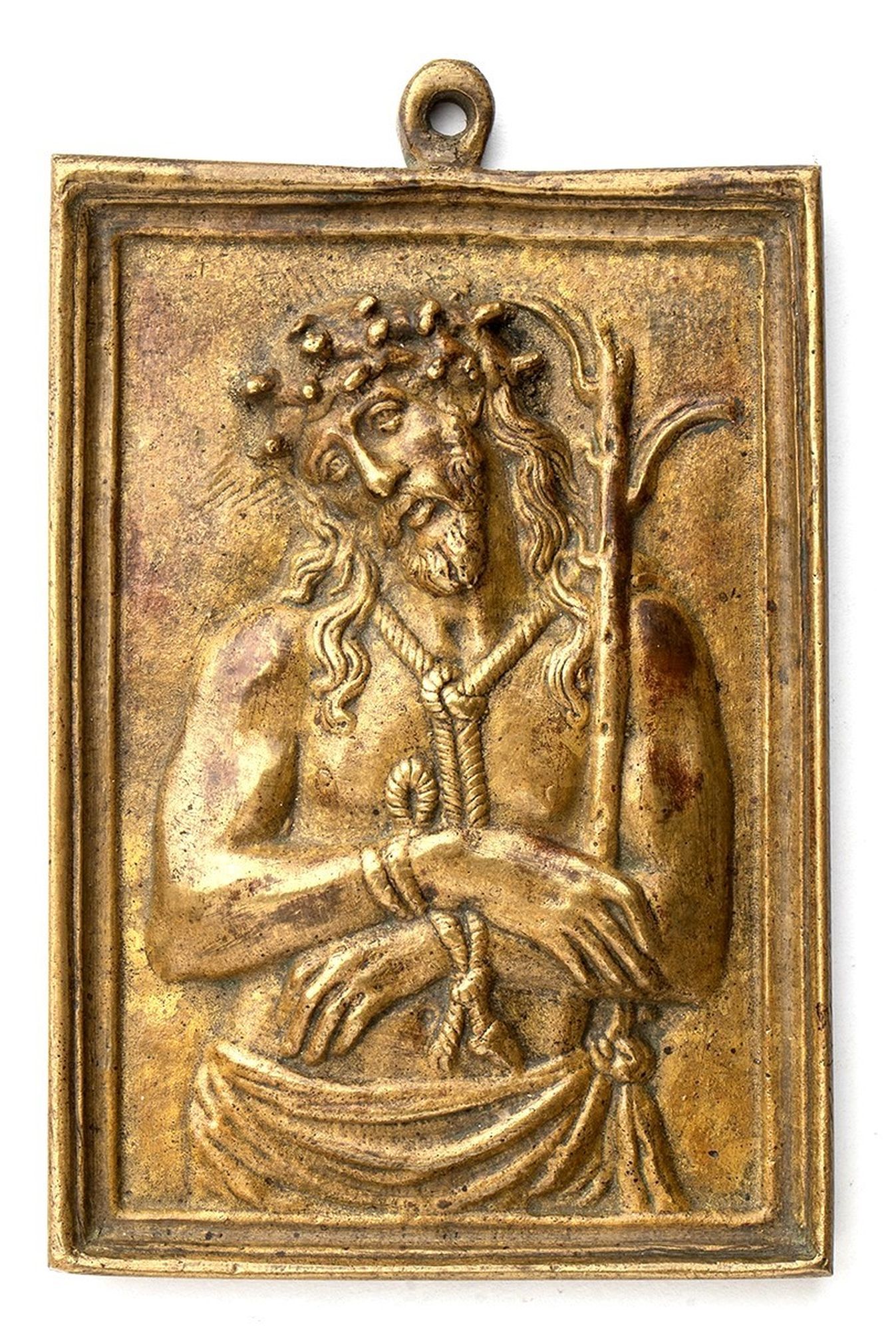 Placchetta in bronzo dorato; anello di sospensione;
