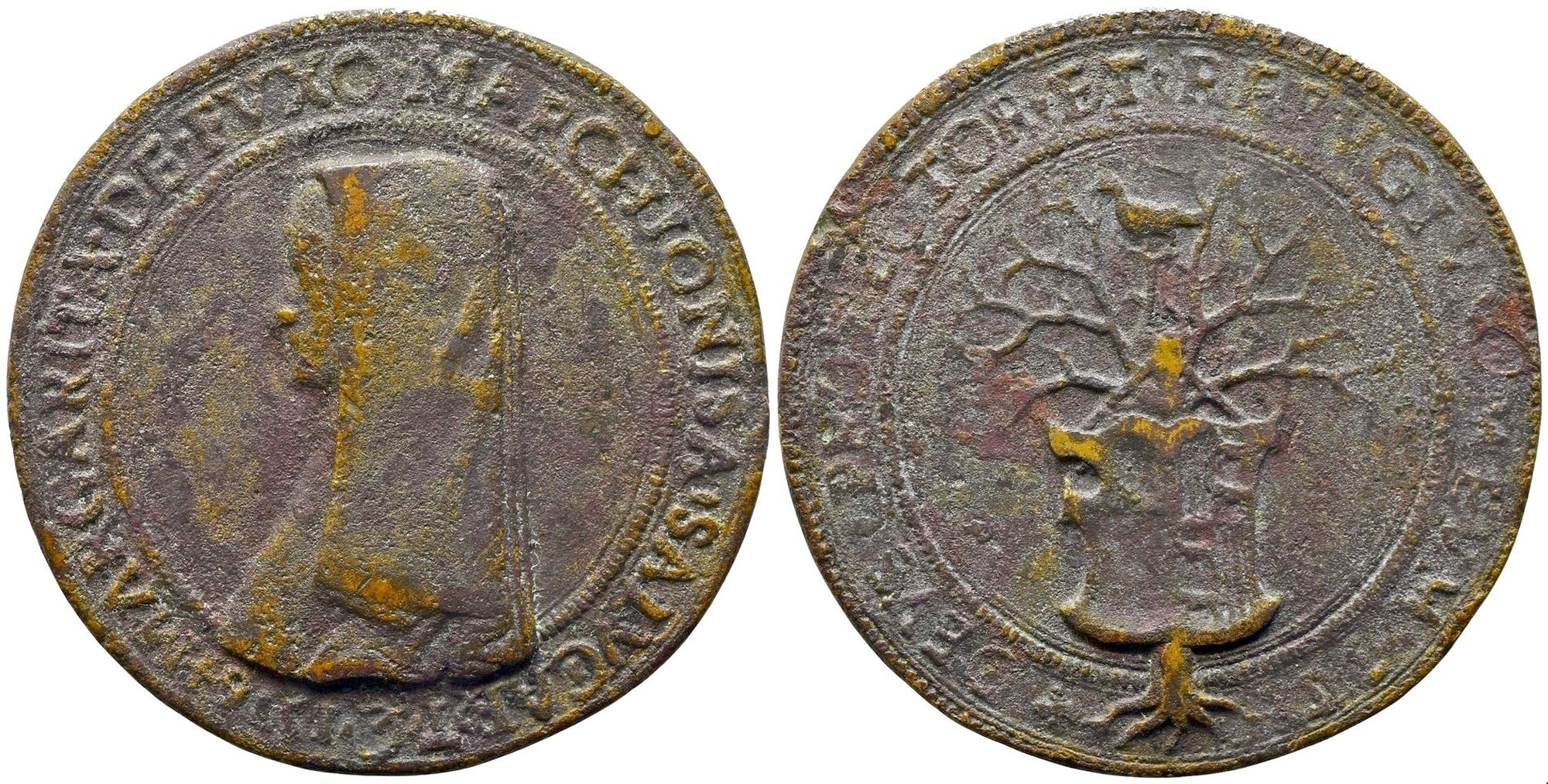 D/ MARGARITA. DE. FVXO. MARCHIONISA. SALVCIAR. Busto a sinistra con capo coperto dal velo di vedovanza