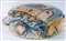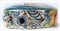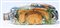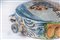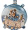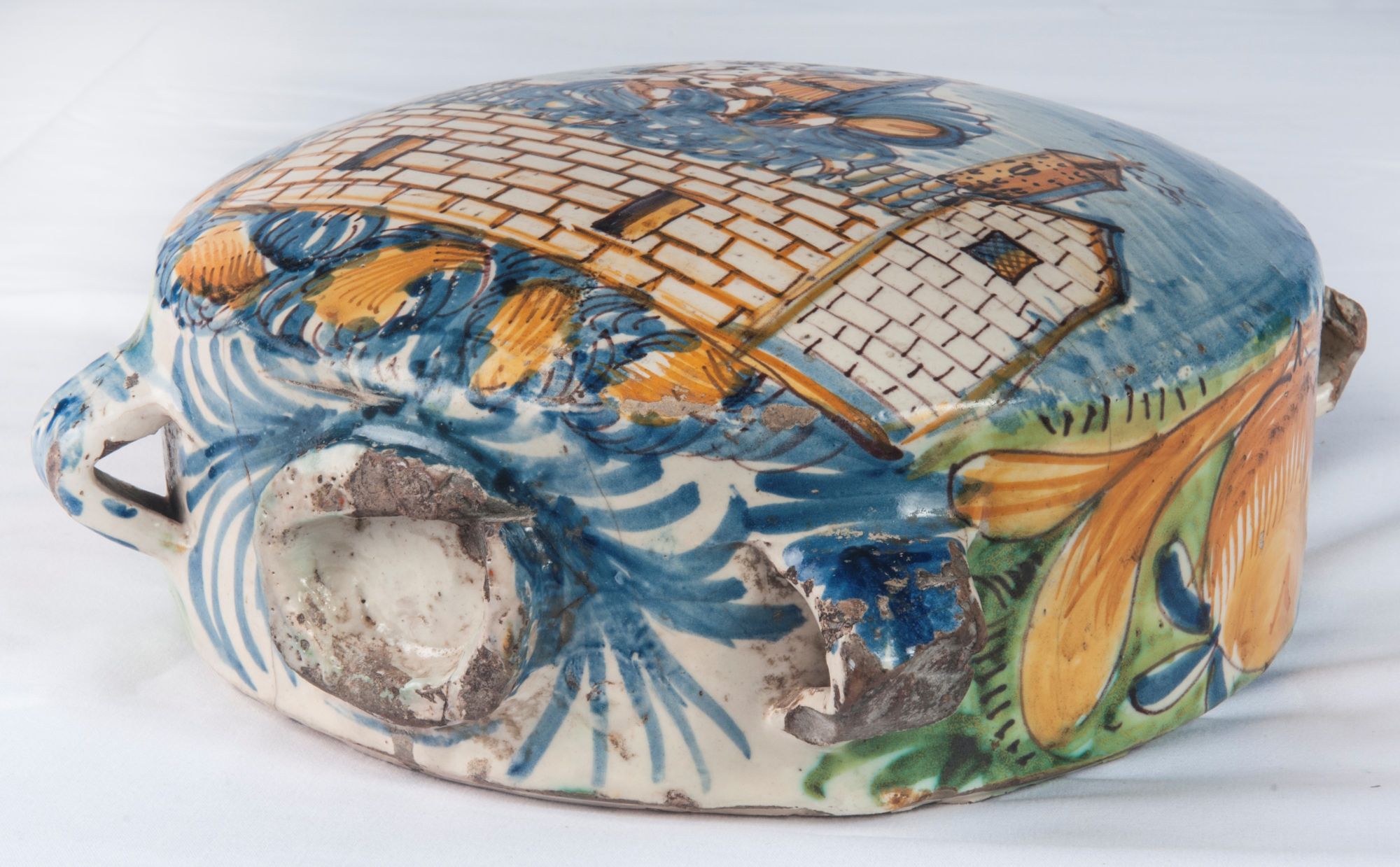 Corpo emisferico con quattro prese laterali ed un versatoio. Retro piatto. Decoro lungo il fianco a frutti e foglie; sul lato bombato miracolo della casa di Loreto con Vergine e Bambino. Al retro lettere e numeri incise nello spessore dello smalto.