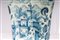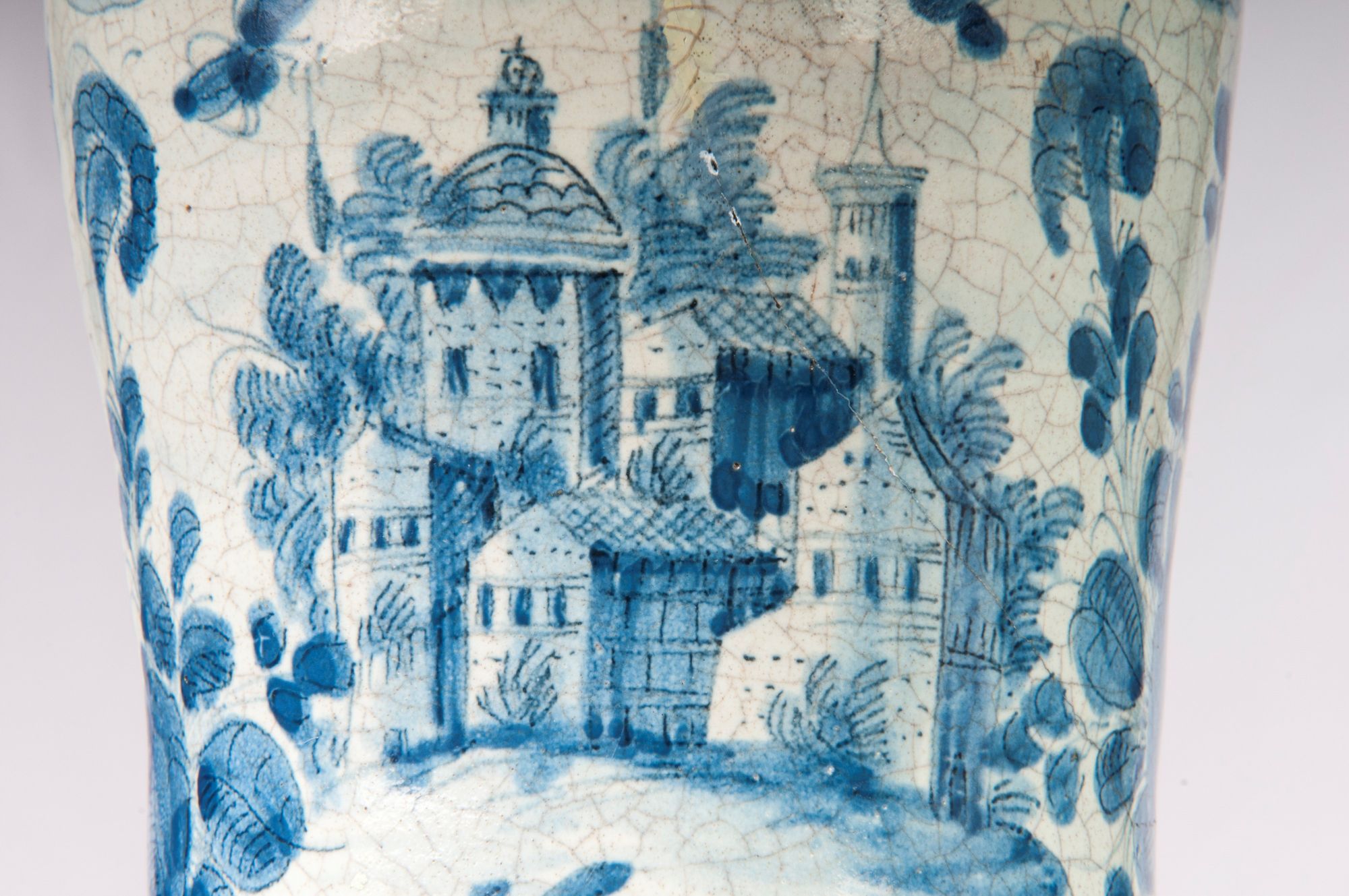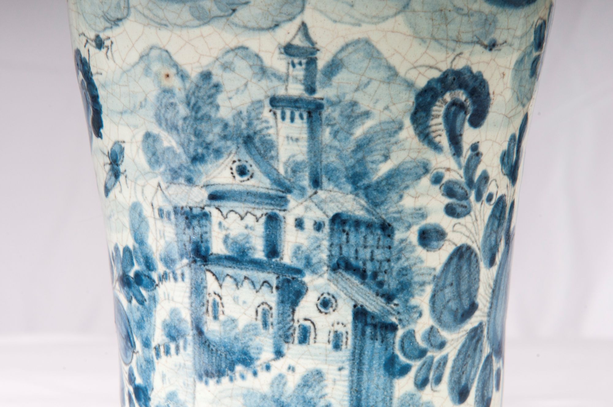 Corpo leggermente rastremato al centro con spalla e base arrotondata. Orlo superiore estroflesso, base a disco tagliata alla stecca. Foggiatura al tornio. Decoro bianco e blu con scena di paesaggio entro riserva. Alla base anteriormente entro cartiglio iscrizione farmaceutica. Al retro iniziali con datazione.