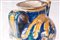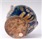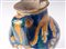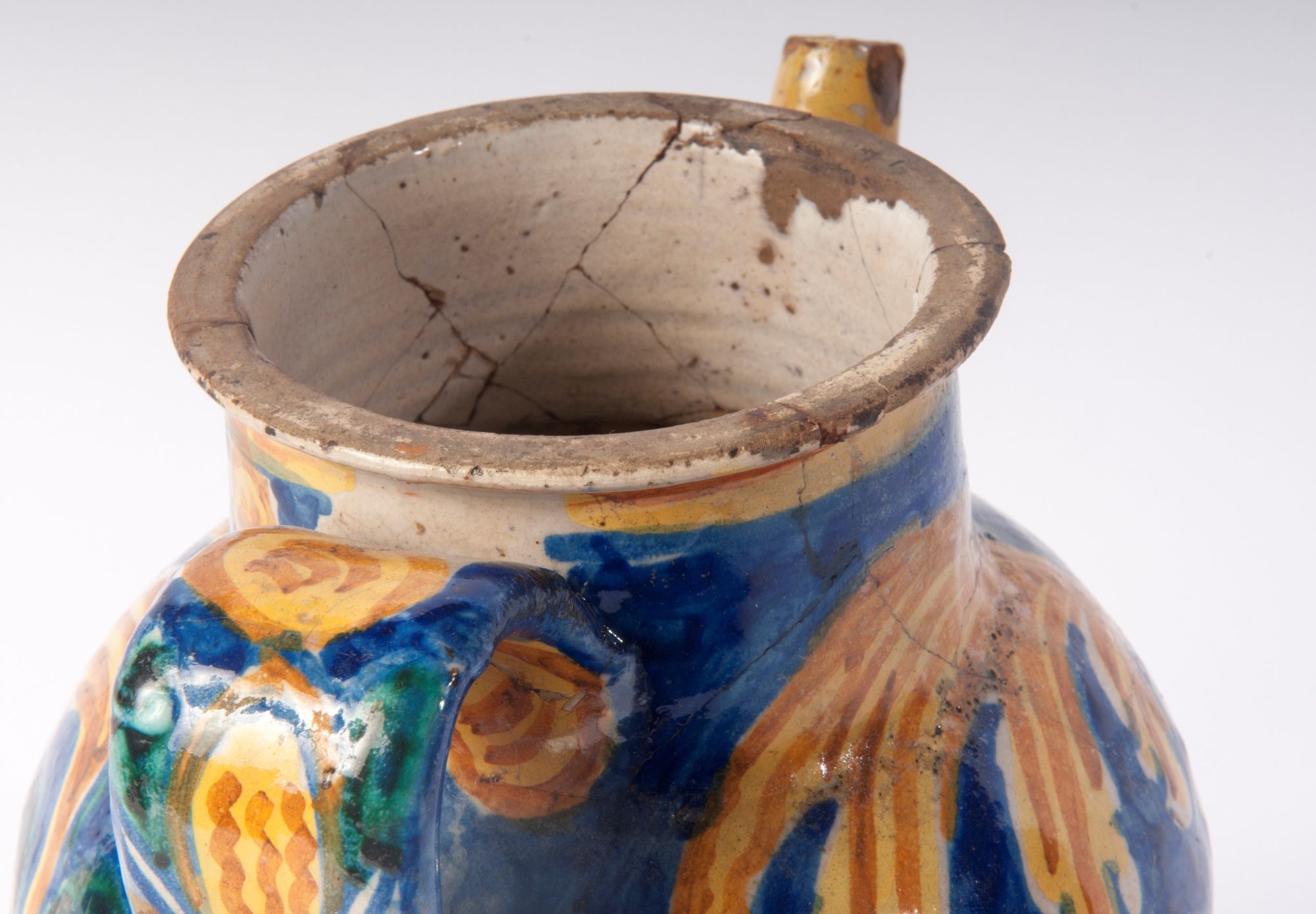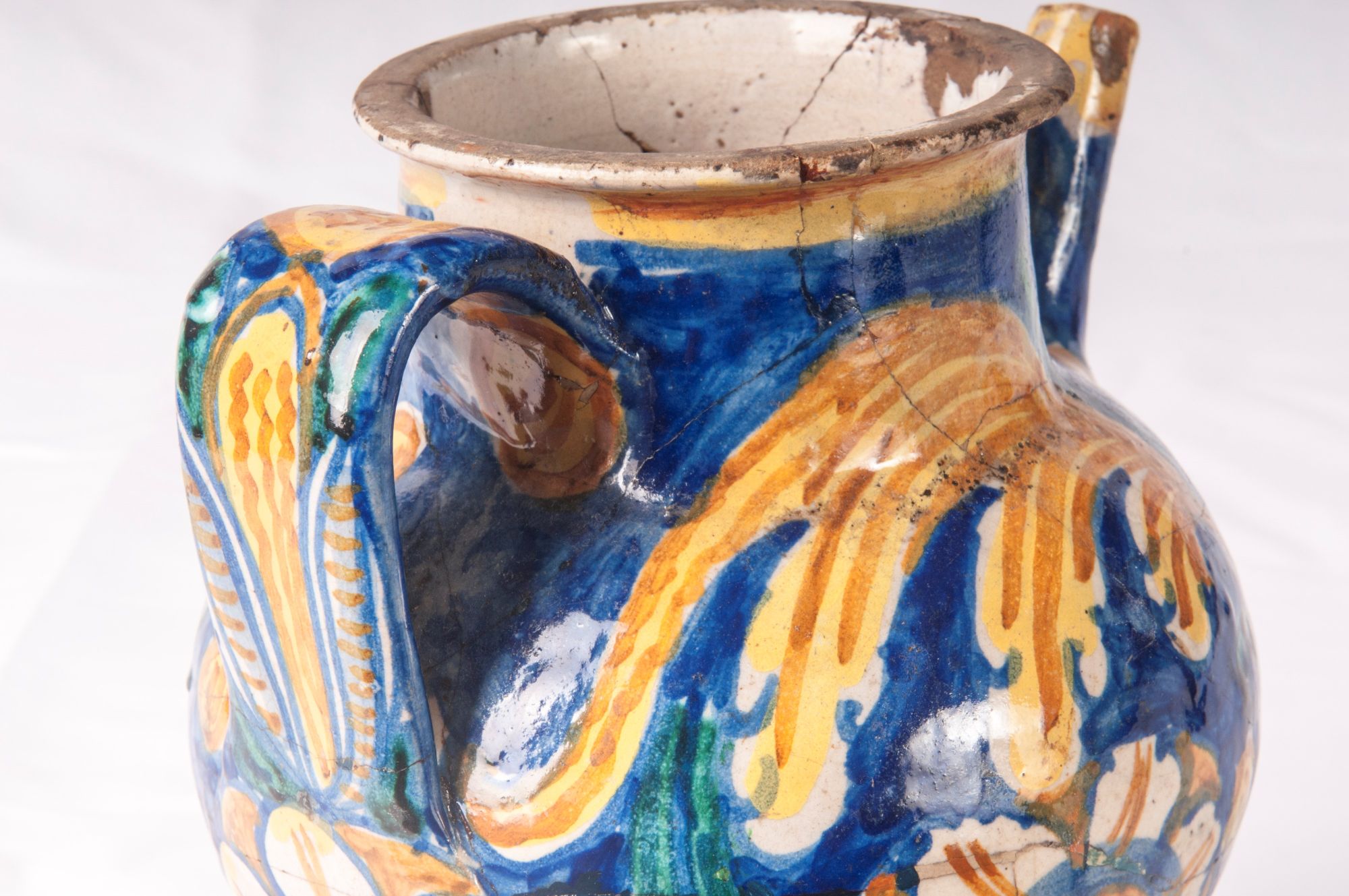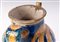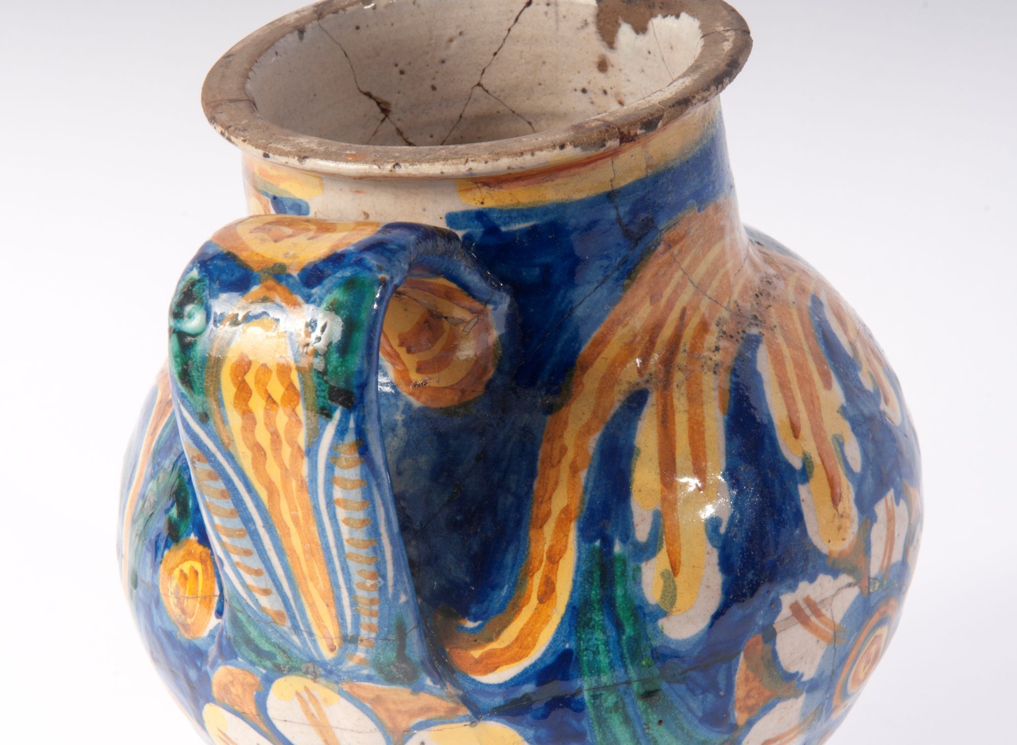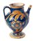 Corpo globulare rastremato verso il basso con corto collo e piede a disco tagliato alla stecca. Sopra la spalla alto collo con orlo estroflesso. Versatoio a tubo e presa a nastro. Modellato al tornio. Decoro floreale su fondo blu a motivi vegetali nelle cromie giallo antimonio, blu cobalto e verde ramina.