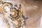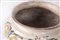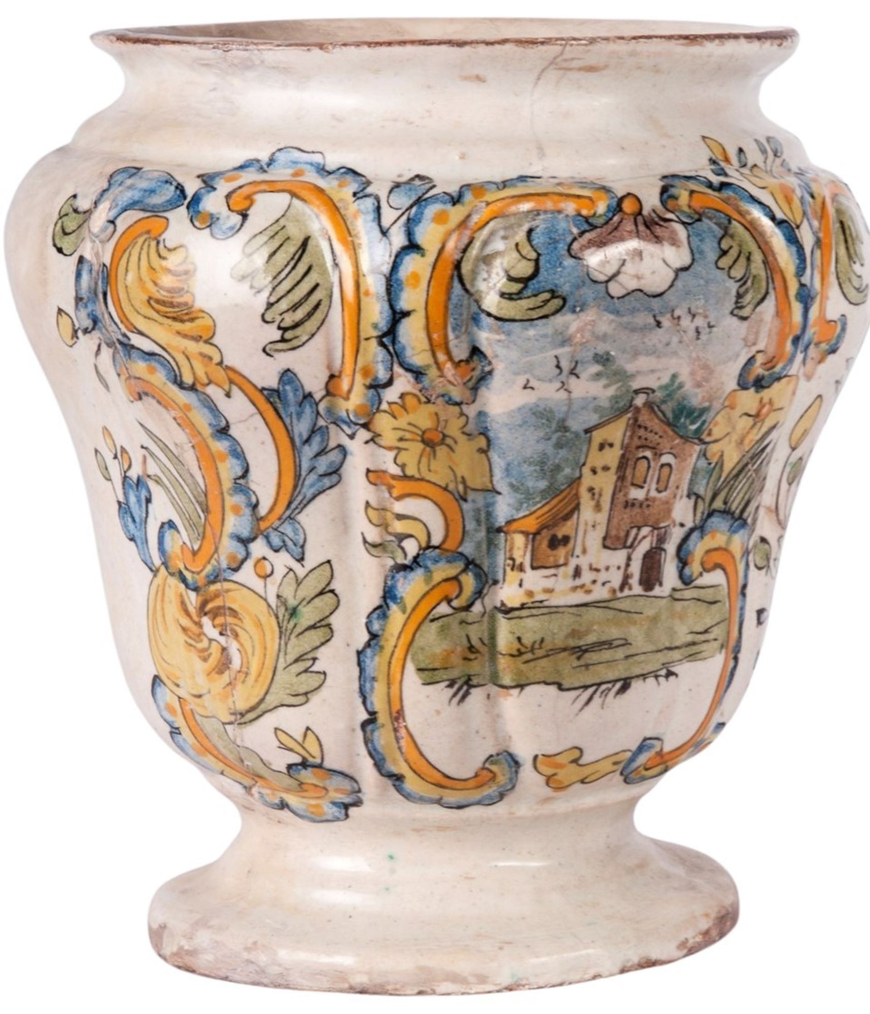 Corpo in parte costolato e rastremato verso il centro di forma tronco conica, piede a disco con fondo ribassato. Collo superiore con bordo leggermente estroflesso. Decoro in policromia a ramages e fogliame che descrive una riserva con all'interno un casolare. Al retro datazione 1746, Officine campane.