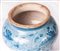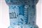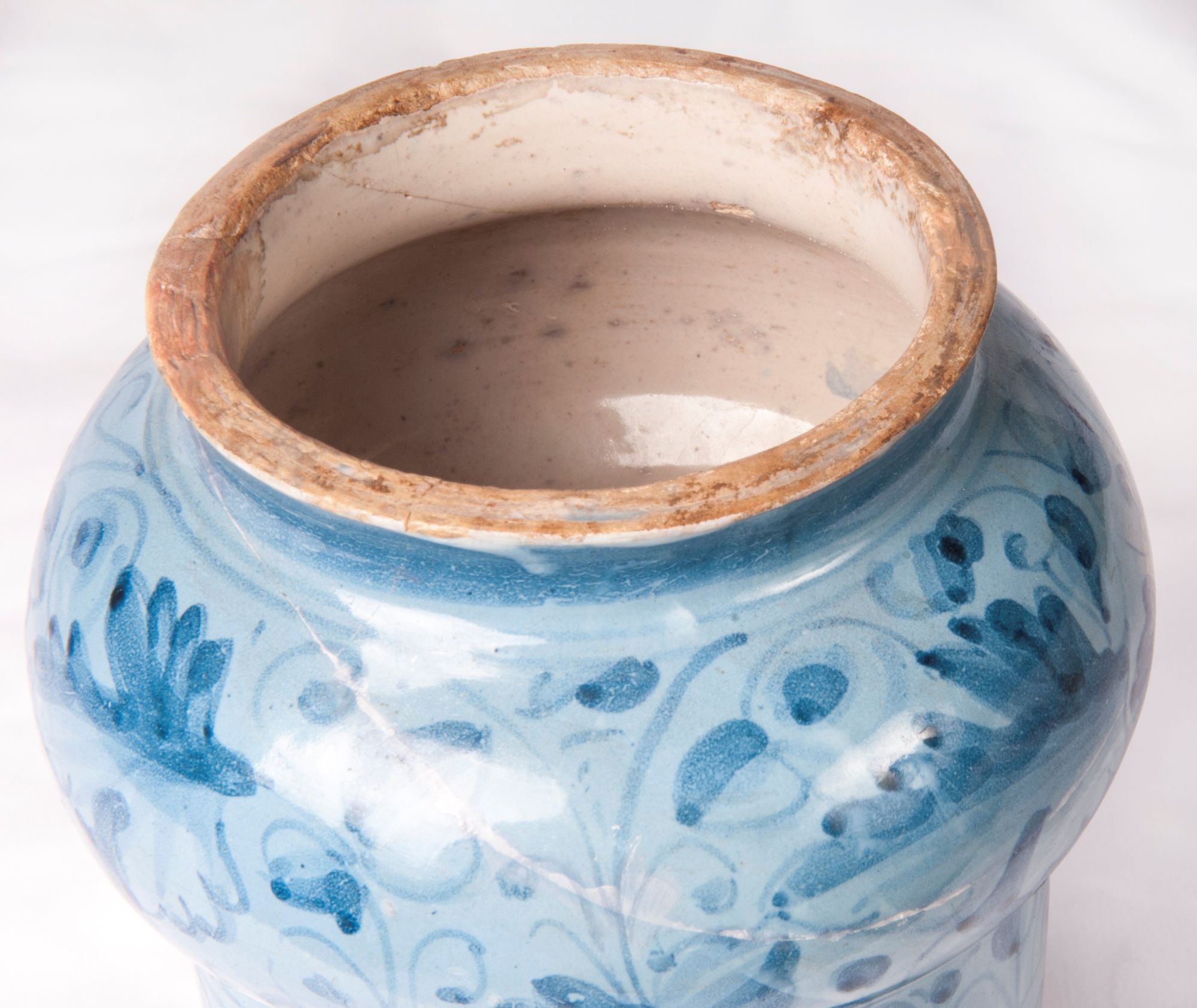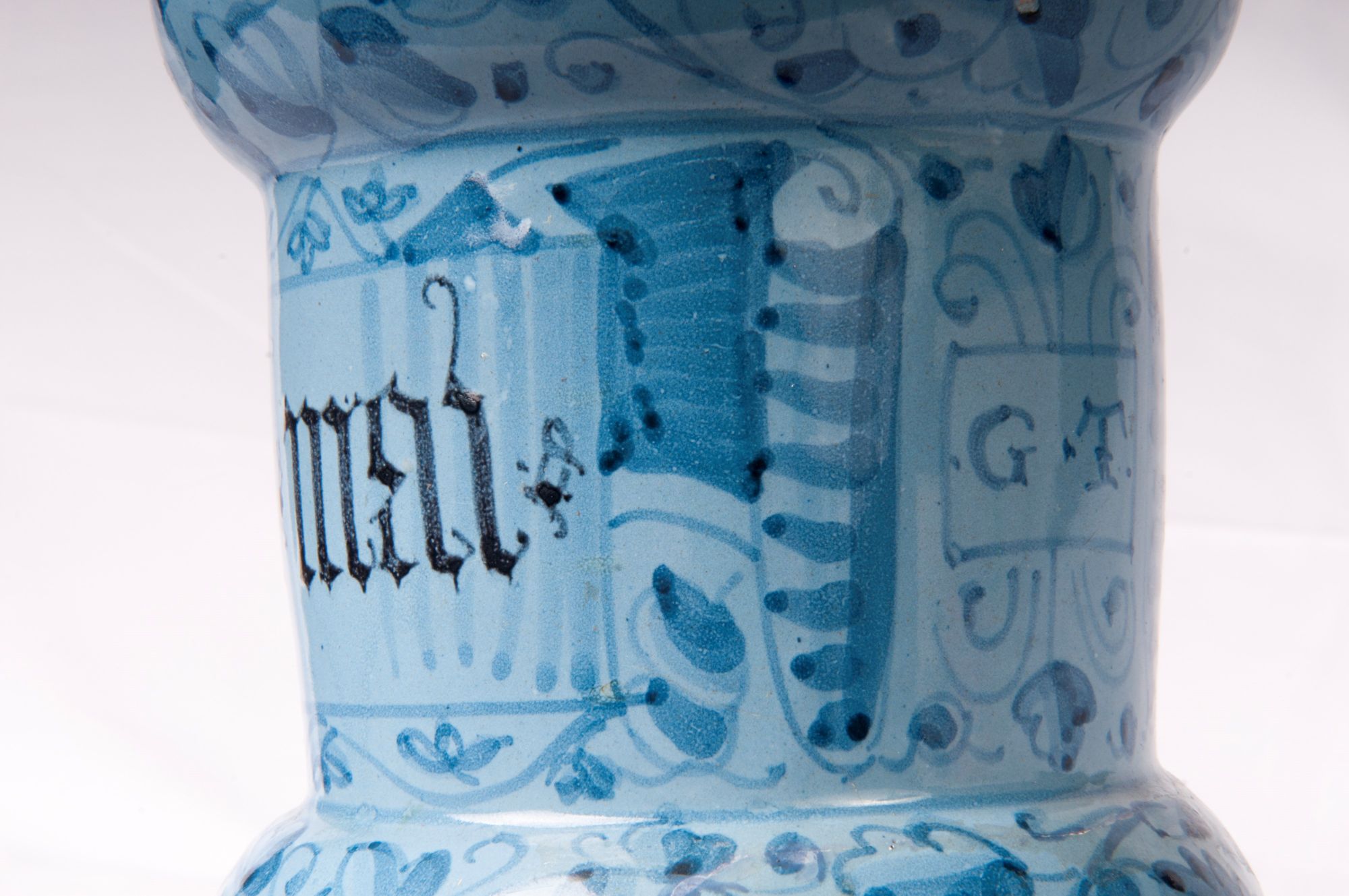 Forma a rocchetto con spalla e base arrotondate e corpo a nastro. Base rifinita a stecca, corpo modellato al tornio. Decoro floreale sul fondo blu berettino con stemma marchionale alla base. Scritta apotecaria in bruno di manganese entro nastro con volute.