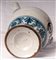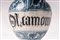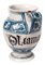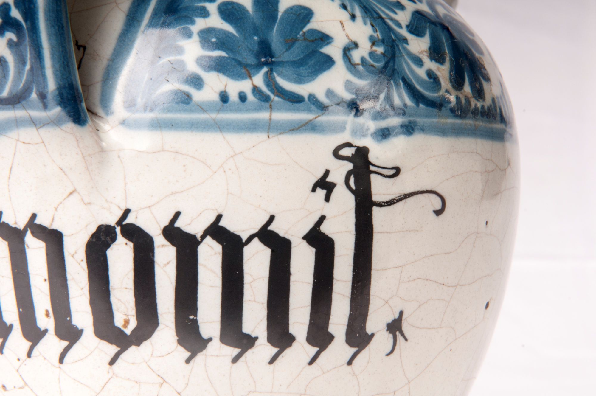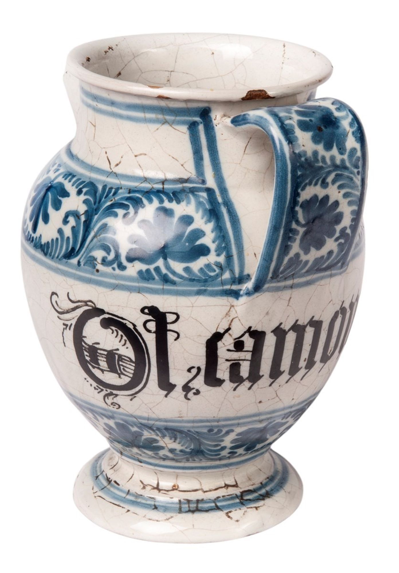 Corpo globulare con alto collo e bordo estroflesso, piede di appoggio a disco svasato. Presa a nastro e versatoio ad imbuto. Decoro a motivi floreali blu su fondo bianco. Centro del corpo individuato da una fascia con iscrizione apotecaria in bruno di manganese.