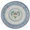 Con corto piede che sorregge un ampio piatto dall'orlo rialzato. Decoro blu a graticcio di foglie con al centro blasone nobiliare, su fondo bianco.