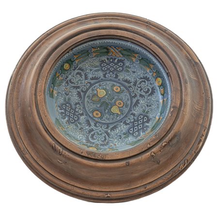 Con corta balza ed ampio fondo ed al retro appoggio anulare. Decoro su fondo in blu berrettino con festoni ad elementi fogliacei e frutta separati da sei composizioni a graticcio e a cuore. Al retro elementi stilizzati in blu cobalto sul fondo berettino. Montato entro cornice linea rotonda non pertinente.