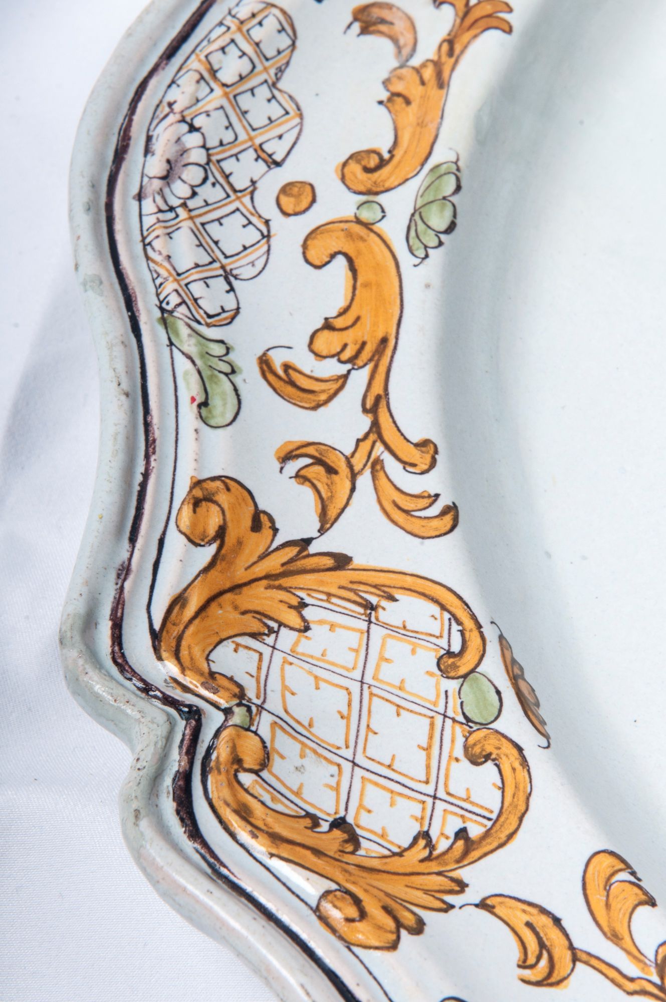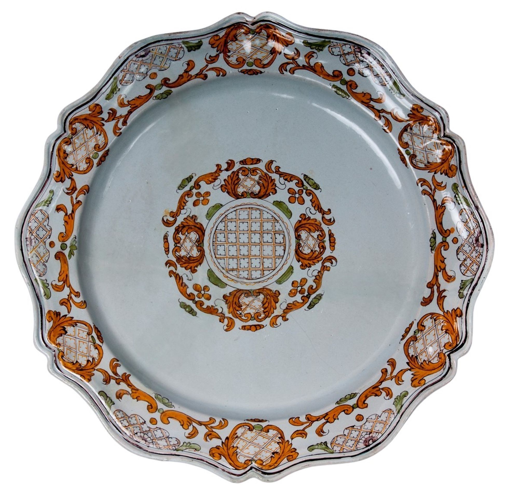 Orlo polilobato a sei punte seguito da una stretta tesa e da un fondo a tutto campo. Retro con poggio liscio. Decoro lungo la tesa e nel centro del cavo a rocailles, ramages e graticci nelle cromie verde marcio, giallo d'antimonio e bruno manganese su fondo bianco e verdino.