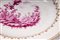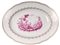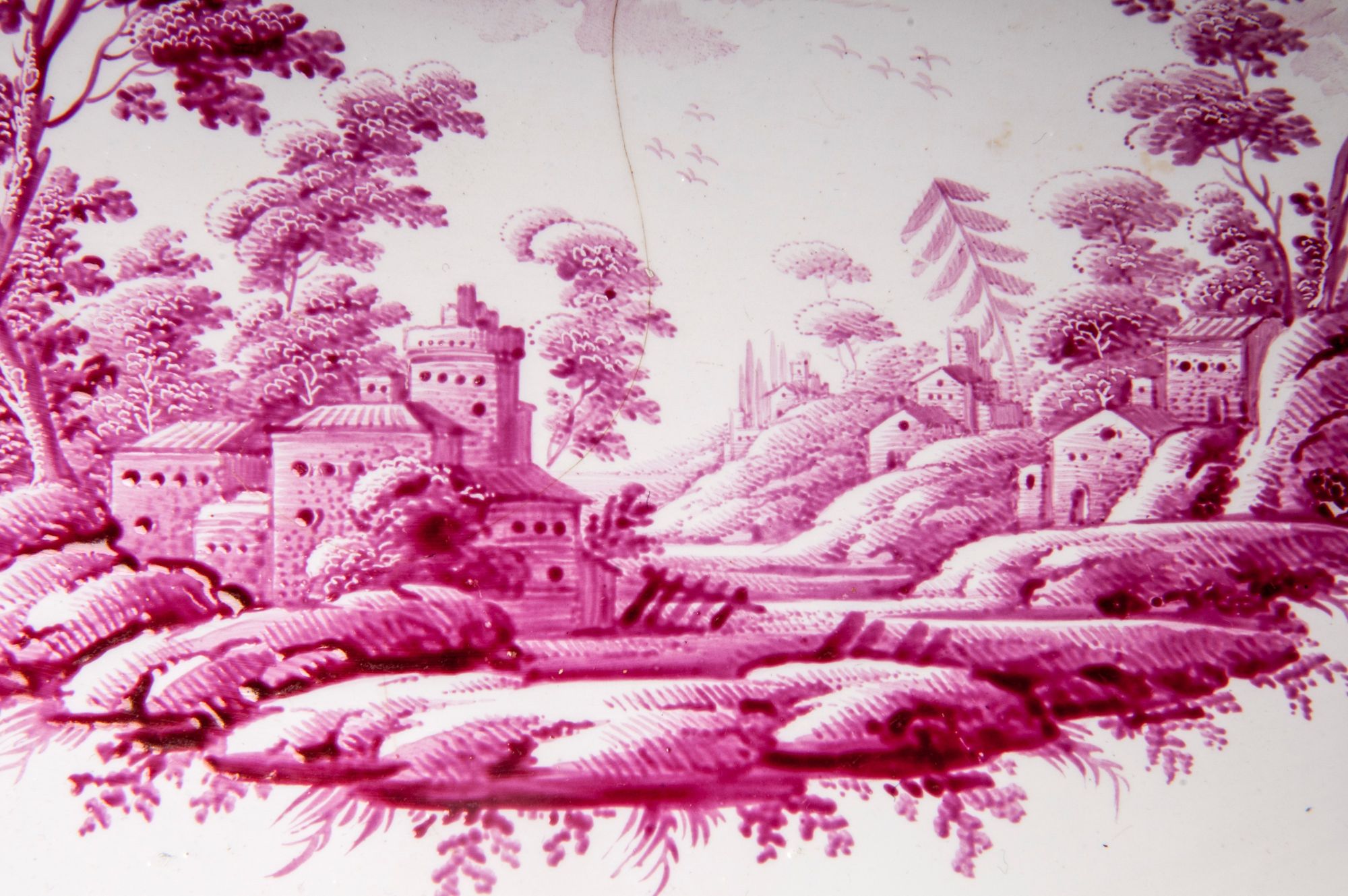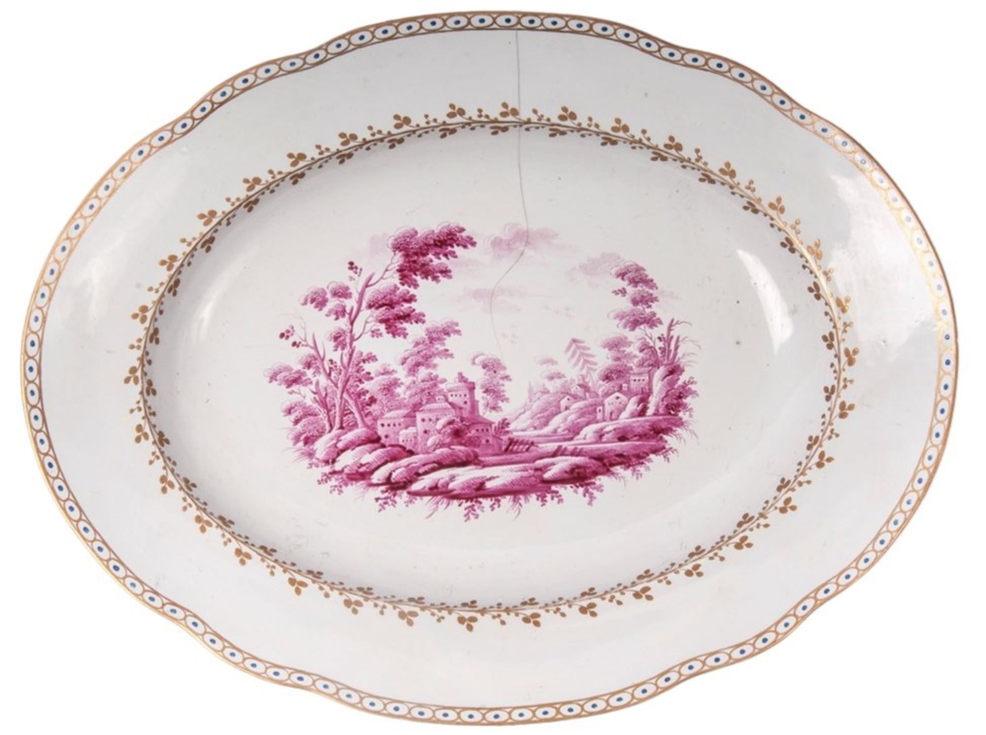 Forma ovale polilobata con appoggio ad anello su fondo ribassato. Dalla ripida tesa con corta balza ed ampio fondo. Decoro a paesaggio in porpora su fondo bianco. Lungo l'orlo motivo ad uovo tagliato dentro nastro dal profilo dorato.