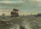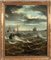 Olio su tela 130 x 107 cm raffigurante imbarcazioni in un mare in tempesta, entro cornice in legno dorato.