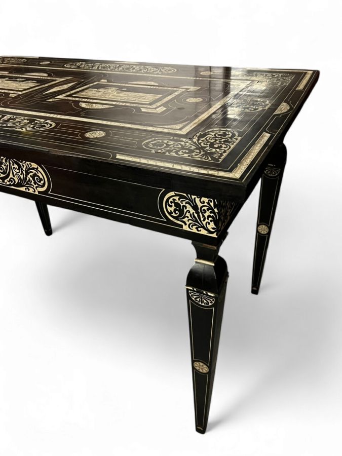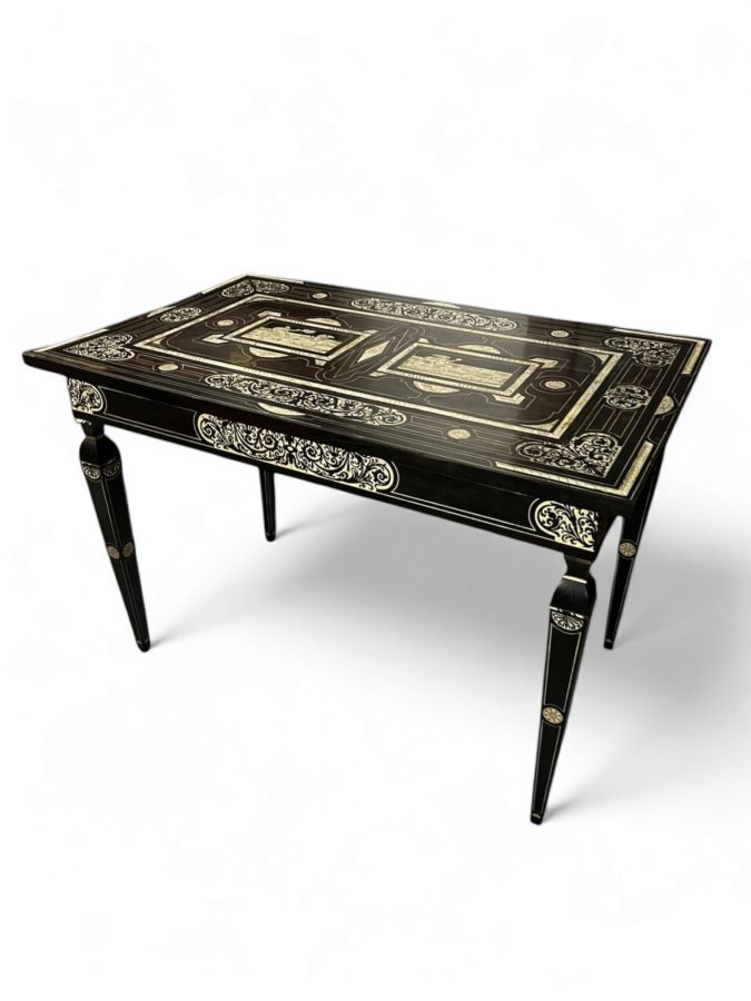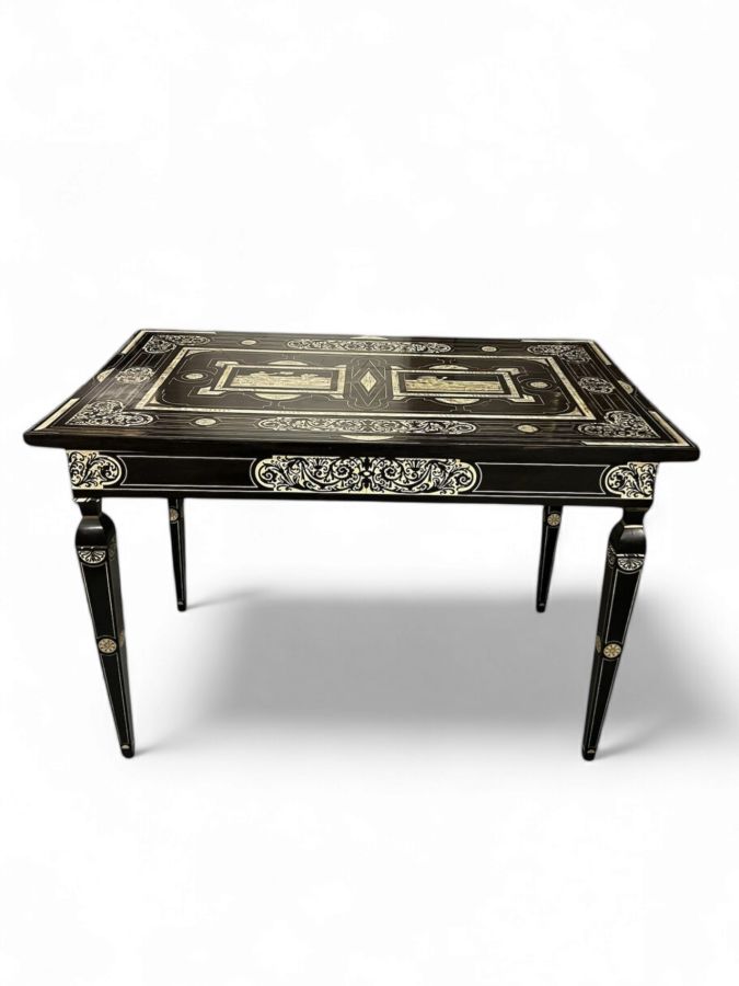 Pogliani Ferdinando (attribuito a) (Milano, 1832 - 1899) Tavolo italiano intarsiato in avorio XIX secolo Altezza x larghezza x profondità: 82 x 121 x 73 cm.