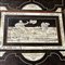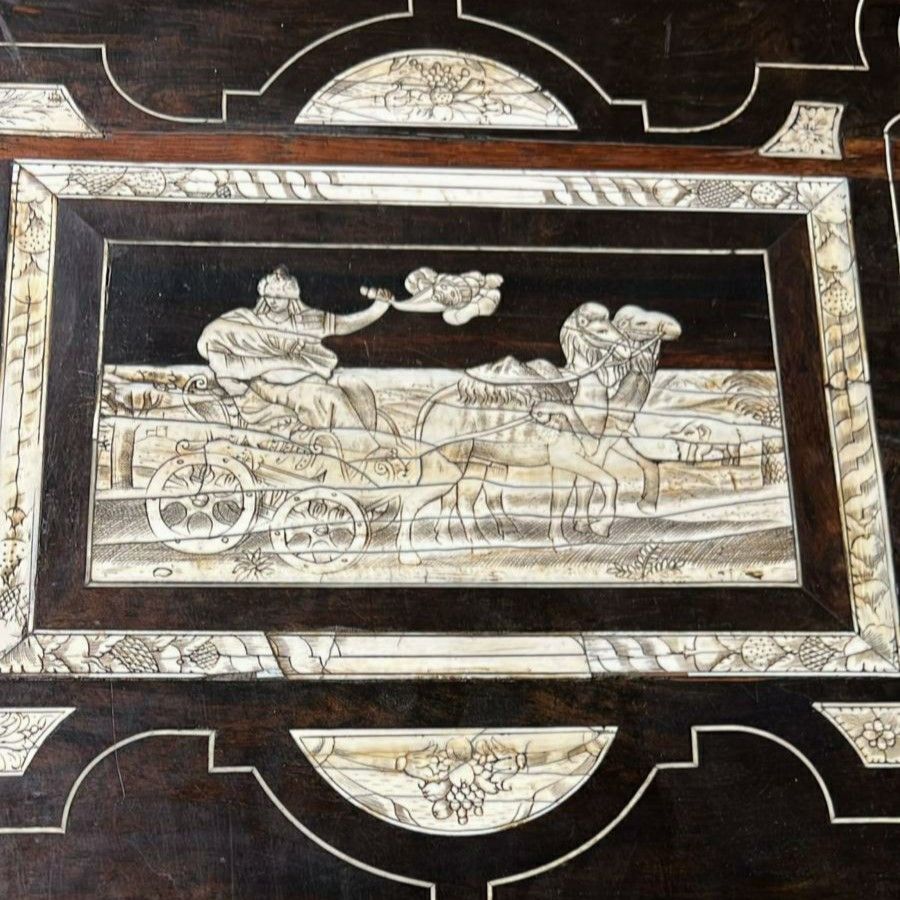 Altezza x larghezza x profondità: 82 x 121 x 73 cm. in legno ebanizzato intarsiato in avorio di elefante (Elephas maximus Linnaeus, 1758 o Loxodonta africana Blumenbach, 1797) con motivi incisi a graffio e passati a china.