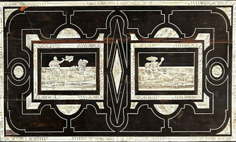 La cornice decorativa e gli angoli del tavolo sono impreziositi da motivi a volute fogliati e geometrici che si ripetono armoniosamente.