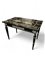 Il tavolo di forma rettangolare poggiante su gambe troncopiramidali, presenta nella superficie superiore un ricco motivo decorativo con dettagli complessi che incorniciano due scene figurative: nella prima, è raffigurata una donna seminuda su un piccolo carro trainato da leoni, affiancata da un coccodrillo, simbolo esotico e mitologico; nella seconda scena, si vede un uomo su un carro trainato da dromedari, richiamando un immaginario orientaleggiante.