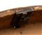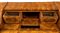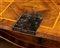 Altezza x lunghezza x profondità 104x130x60 cm lastronata in noce e intarsiata a motivi geometrici in legno di bosso, anta a calatoia a celare scarabattolo interno con due cassettini laterali e vano scorrevole sul piano, base sagomata con piedi a mensola.