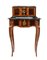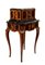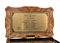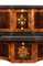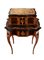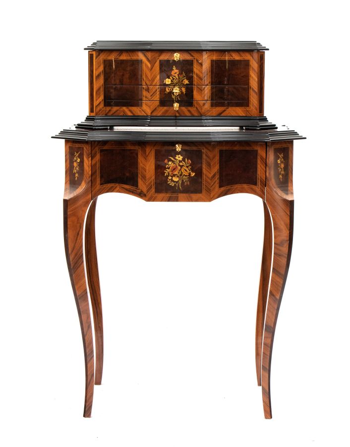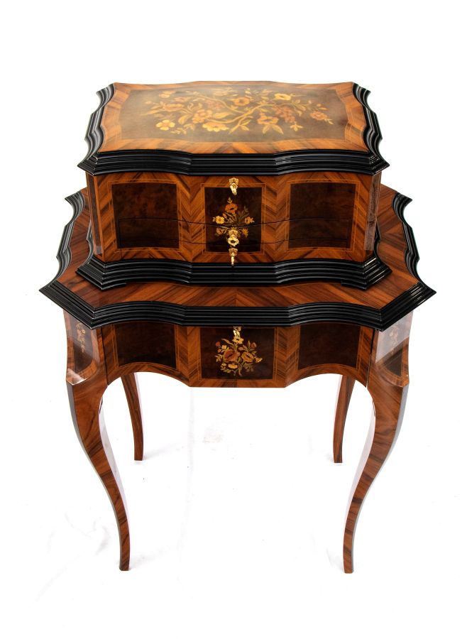 Altezza x larghezza x profondità 115x72x54 cm doppio corpo, dalle forme sagomate, in noce radica di noce e intarsiato in legni di frutto che formano decorazioni floreali, composto da una struttura superiore che contiene il meccanismo musicale a cilindro e una parte inferire formata da cassetti contenenti cilindri musicali intercambiabili. Maniglie e serrature dorate.