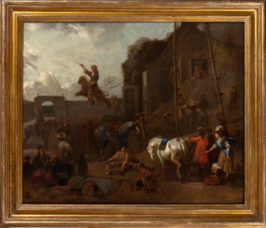 Altezza x larghezza: Cornice 67 x 78 cm Telaio 55 x 67 cm olio su tela raffigurante una festa con attività circense in un villaggio, scuola fiamminga cerchia di Jan Miel , detto Giovanni Miel o anche Giovannino delle Vite(1599-1663). Cornice coeva.