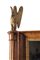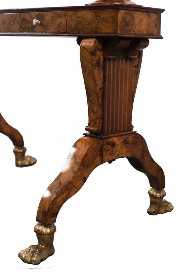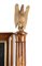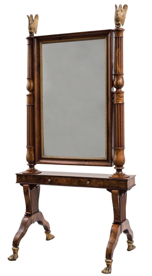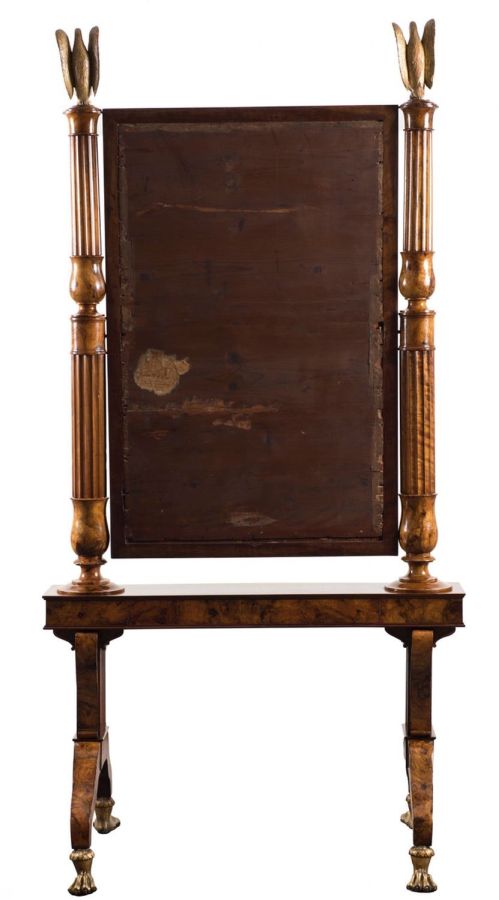 Dimensioni: 70x110x215 cm. in noce e radica di ulivo. La cornice dello specchio è decorata con volantini Impero. I supporti dello specchio sono colonne scanalate sormontate da due aquile in legno intagliato e dorato. Nella zona centrale lo specchio ha un cassetto. Supporti alla base con base a lira con gambe divaricate in un piede ferino con legno intagliato e dorato.