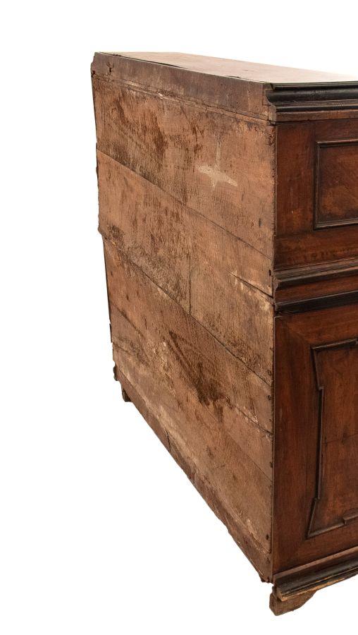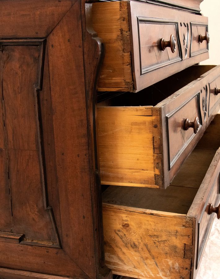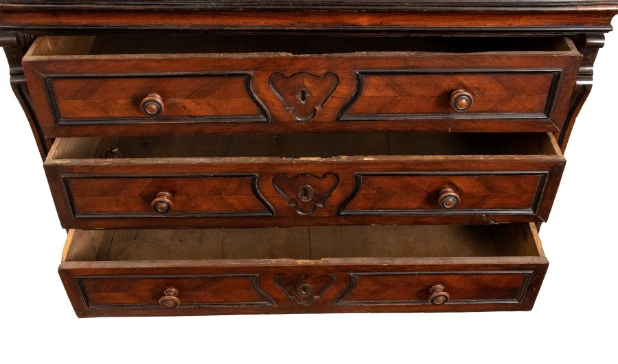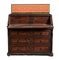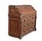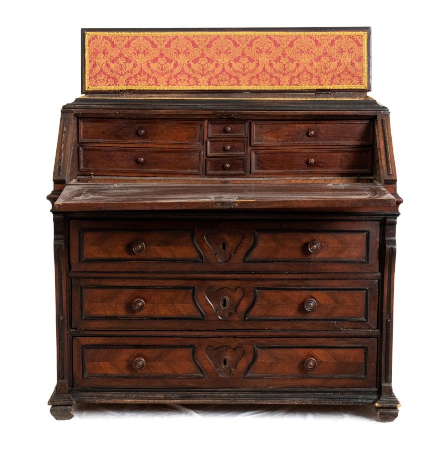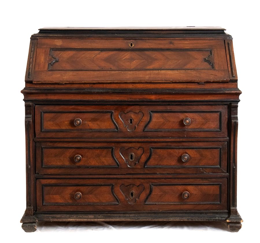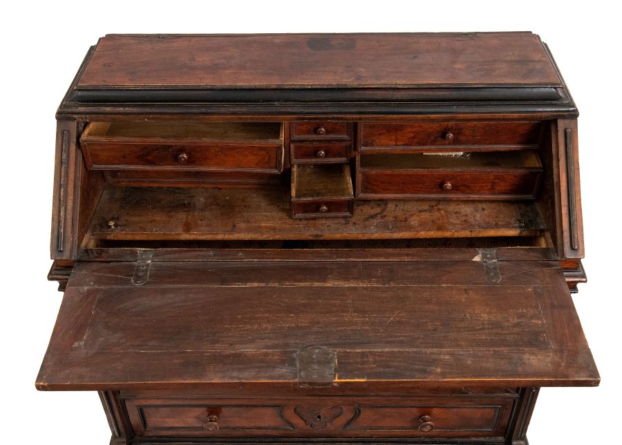 Altezza x lunghezza x profondità: 111 x 116 x 54 cm. interamente lastronata in noce, anta a calatoia a celare scarabattolo interno con sei cassettini su tre colonne e vano segreto sul piano, tre cassetti sottostanti; fronte e fianchi ornati da riserve con cornici mistilinee ebanizzate, base dritta su piedi a plinto.
