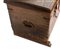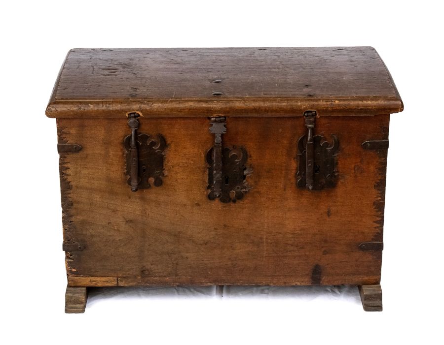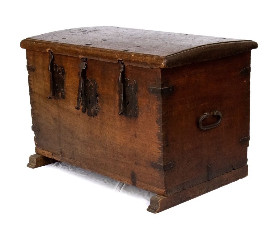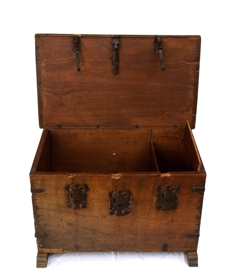 Altezza x larghezza x profondità: 56 x 90 x 54 cm in legno di noce, con rinforzi in ferro laterali e chiusura a tre serrature.