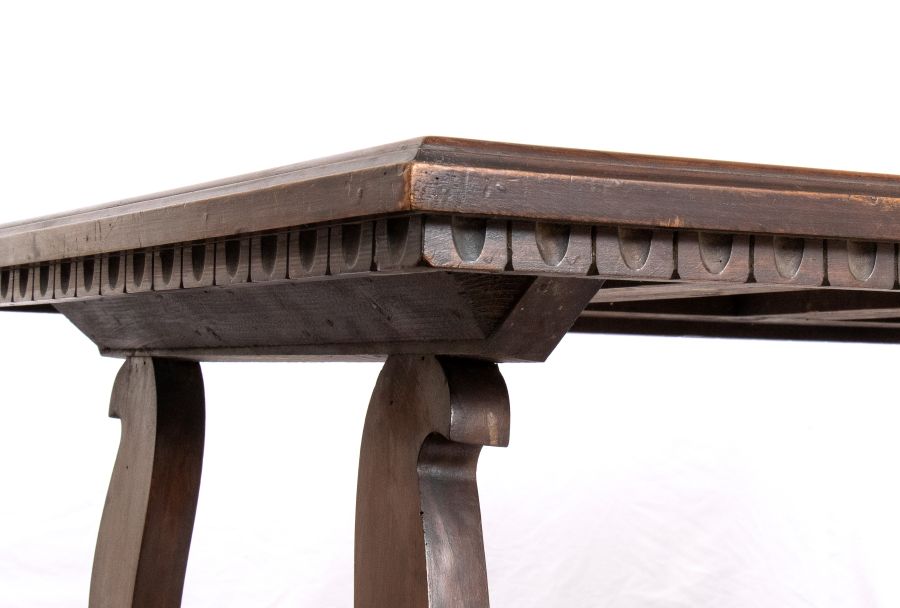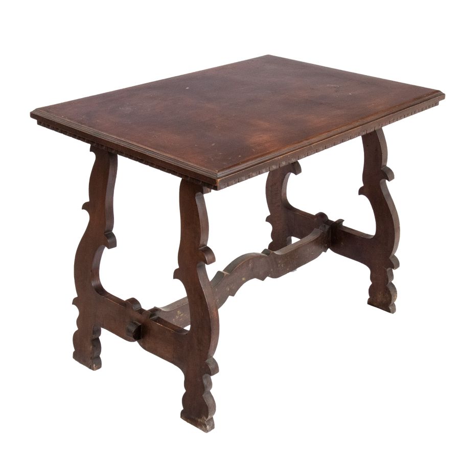 Altezza x laghezza x profondità: 79 x 100 x 70 cm in legno di noce con gambe a lira raccordate da traversa mossa.