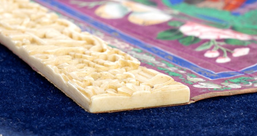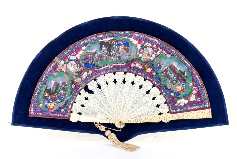 Ventaglio cinese in osso Dinastia Qing, XX secolo Dimensioni ventaglio 28 x 51,5 cm, con cornice 63 x 29 cm. Peso 1650 gr.