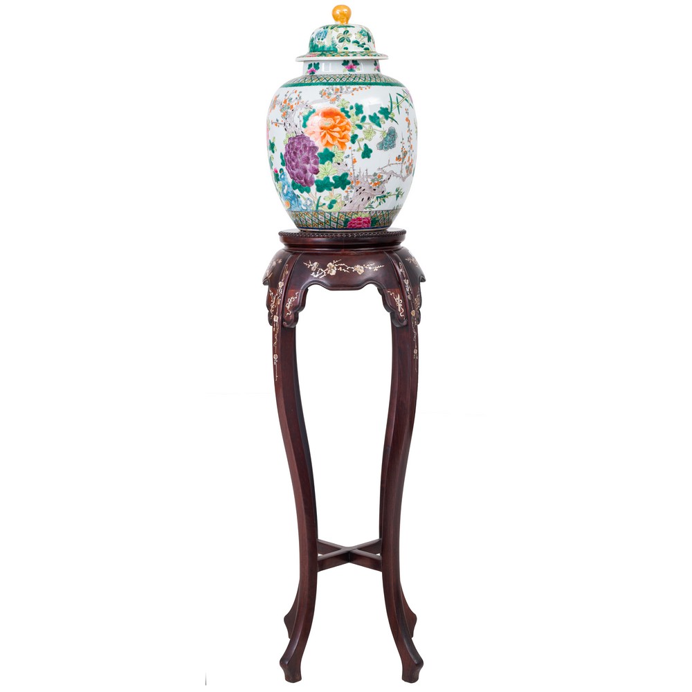 Cantone in legno esotico con tarsie in madreperla e vaso con coperchio in porcellana decorata a motivo floreale e naturalistico.