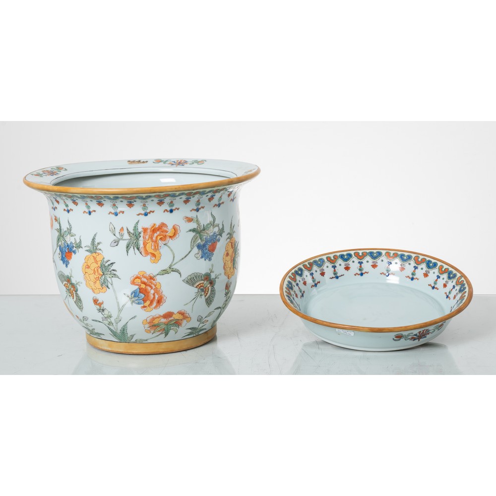 PORTAPIANTE con sottovaso in porcellana decorata.