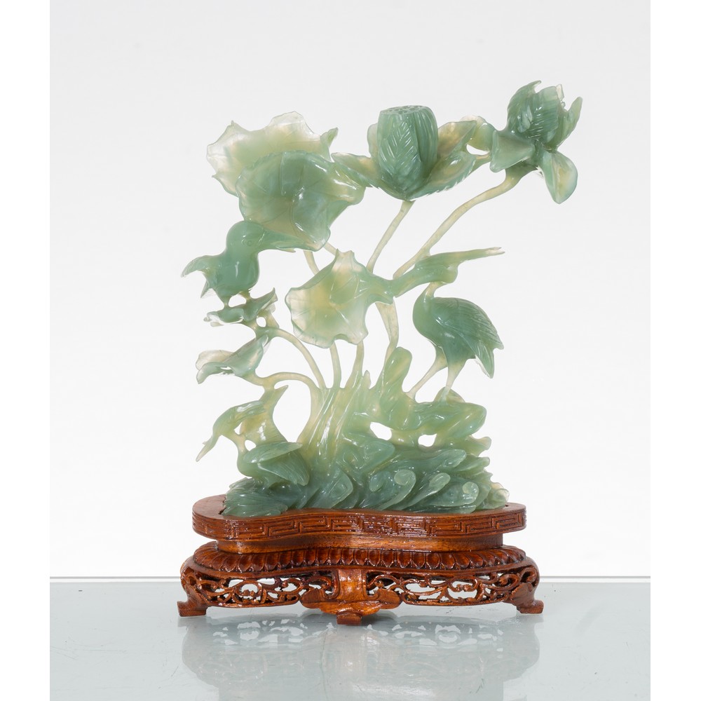 Scultura in giada raffigurante "Composizione con volatile" , base in legno.