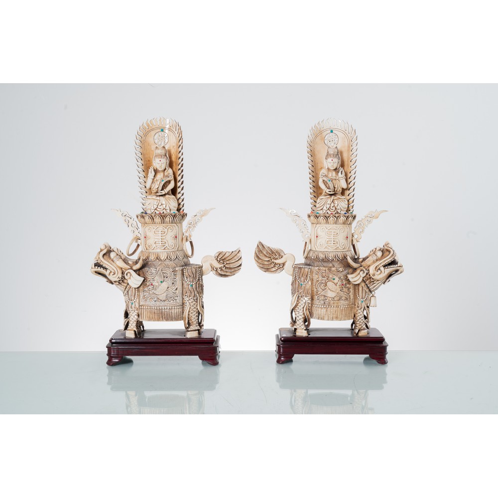 Importante coppia di grandi sculture in avorio cesellato e scolpito raffiguranti "Grandi animali che sorreggono due divinità su trono" con basi in legno. Le opere sono corredate da certificato Cites.