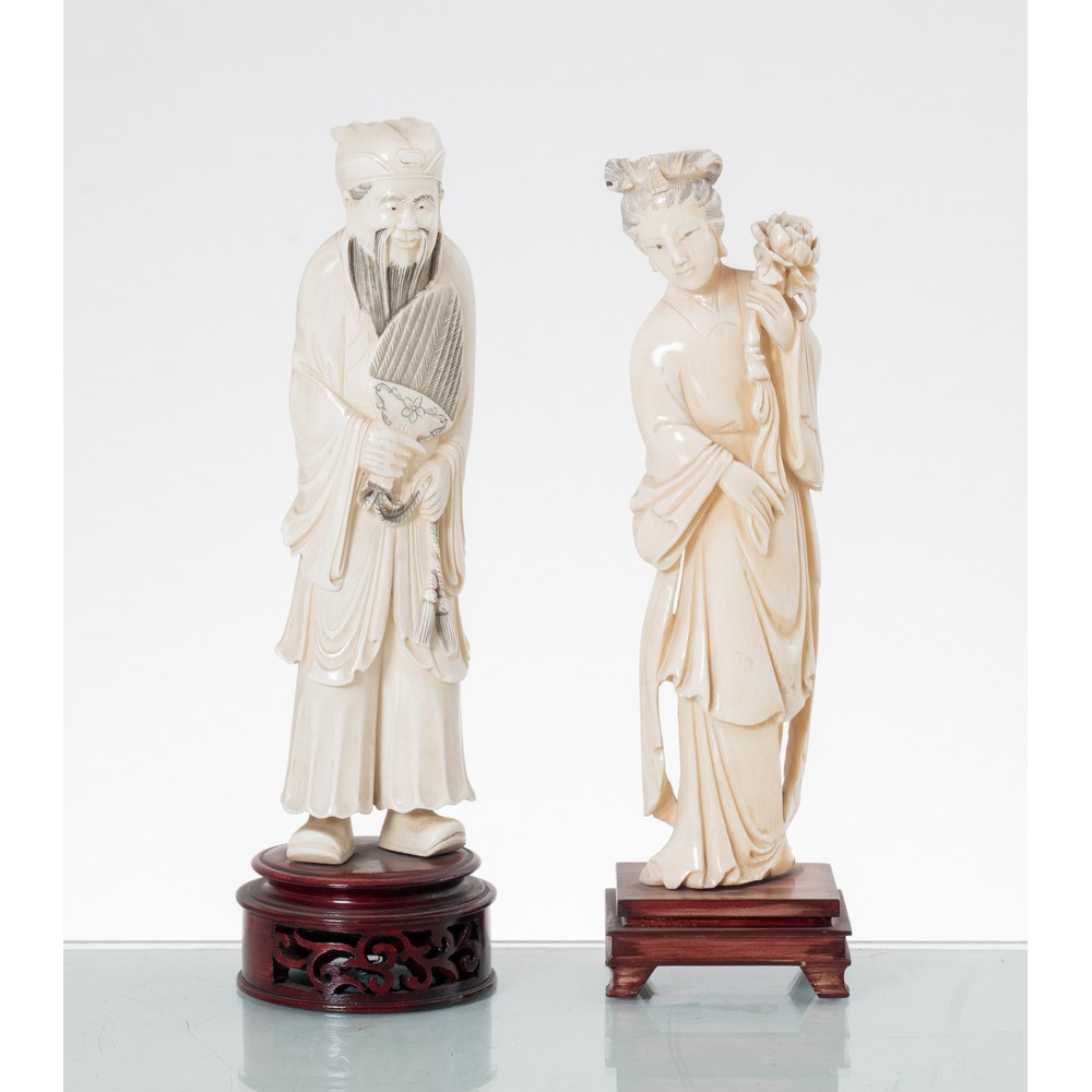 Due sculture in avorio raffiguranti "Figura maschile con barba e ventaglio" e "Figura femminile con rosa tra le braccia" con basi in legno. Le opere sono corredate da certificato Cites.