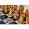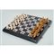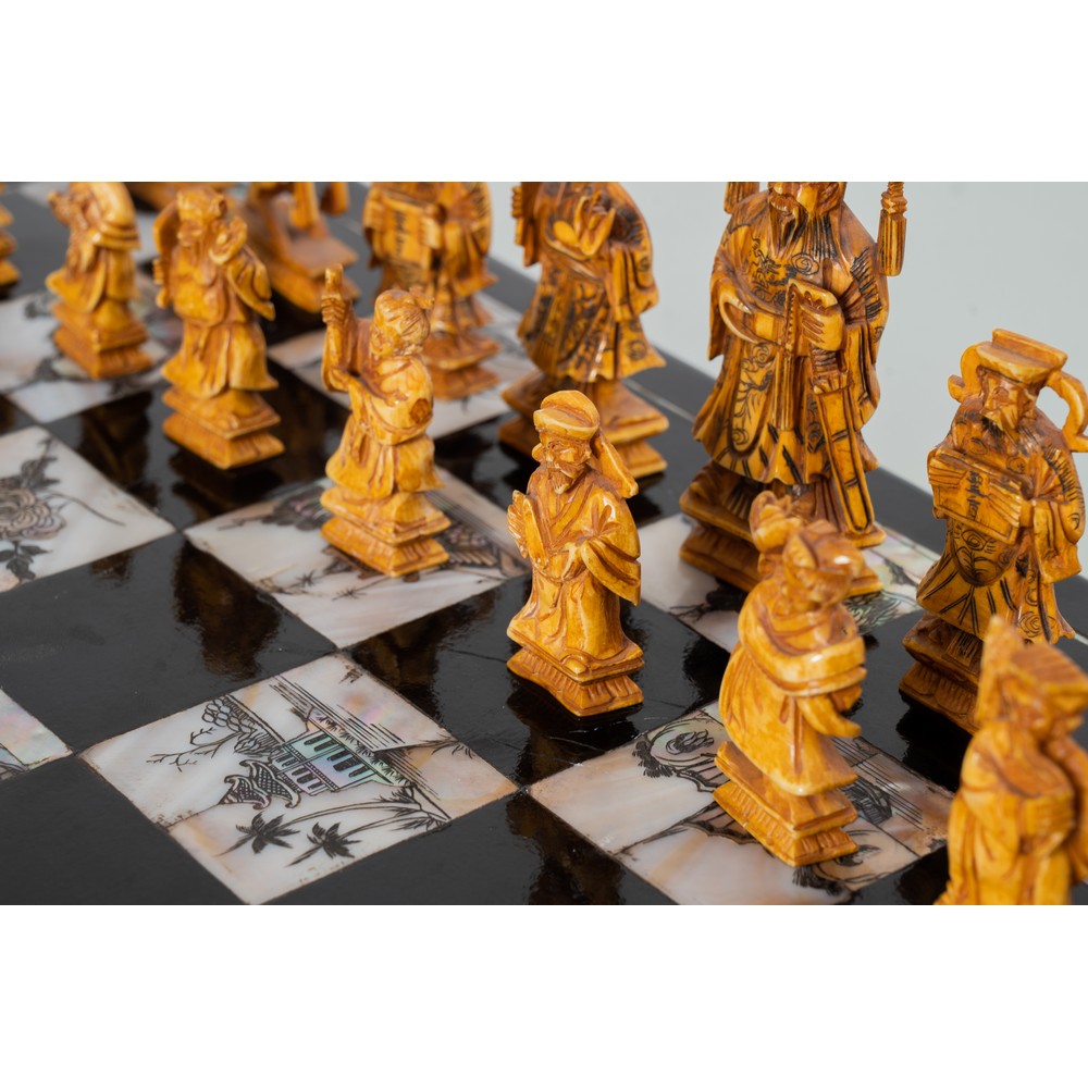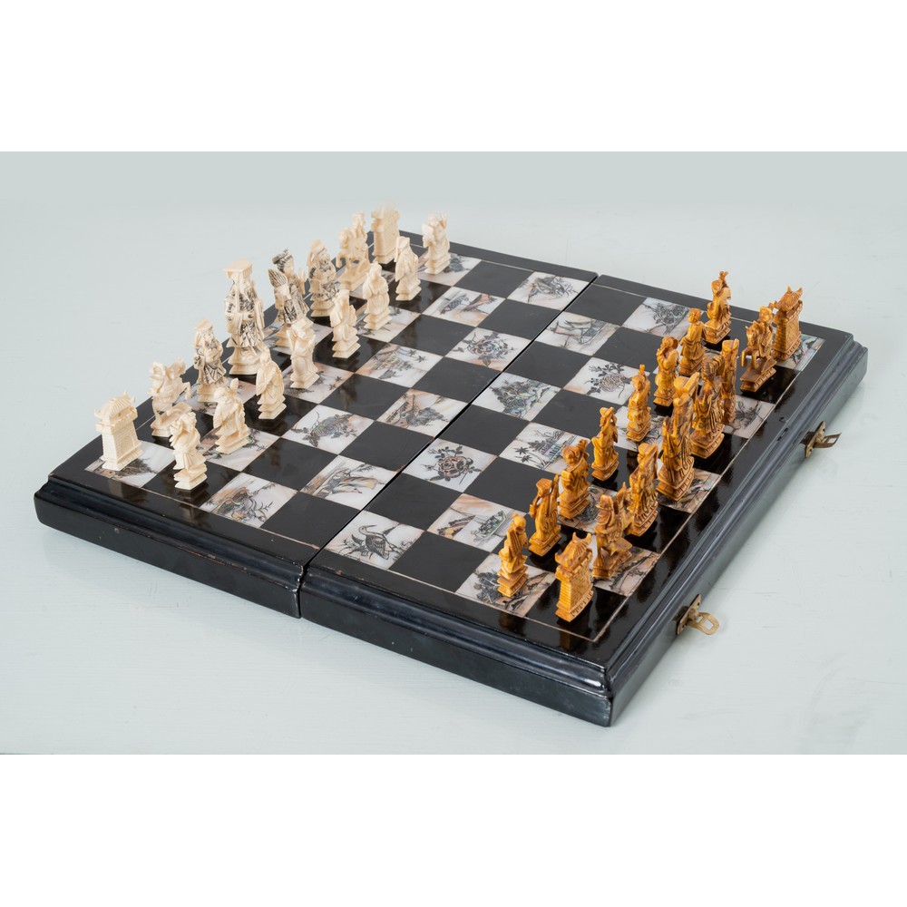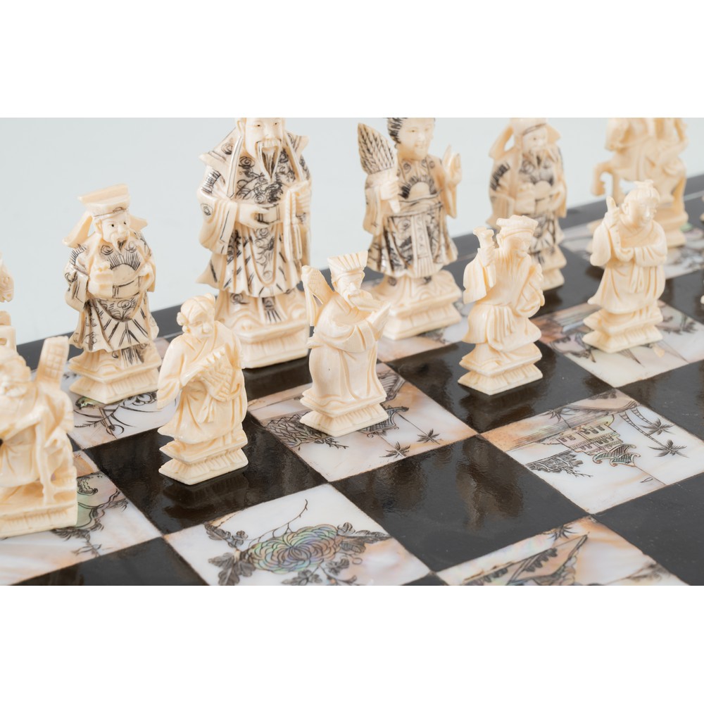 Scacchiera in legno ebanizzato con intarsi in madreperla, contenete trentadue pedine in avorio di cui sedici nei toni del bianco e sedici nei toni del marrone. L'opera è corredata di certificato Cites.