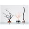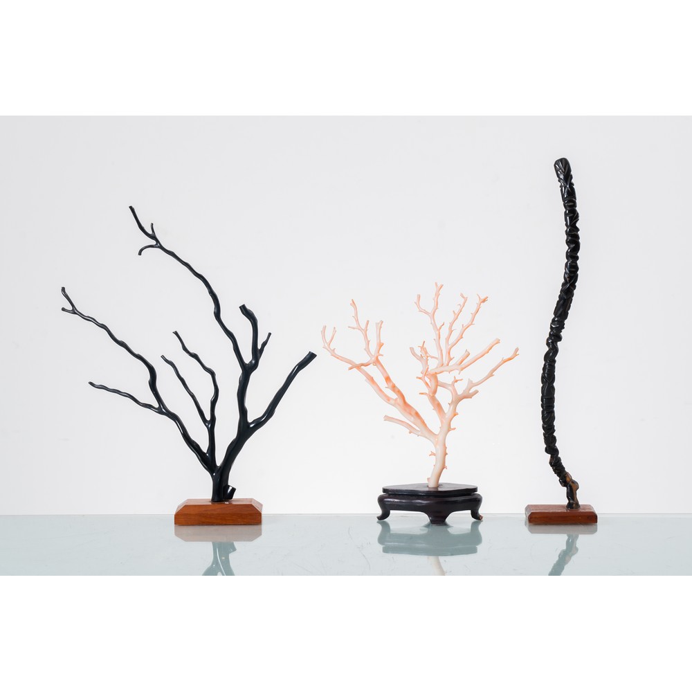 Tre rami di corallo con basi in legno di cui uno in corallo rosa e due in corallo nero.