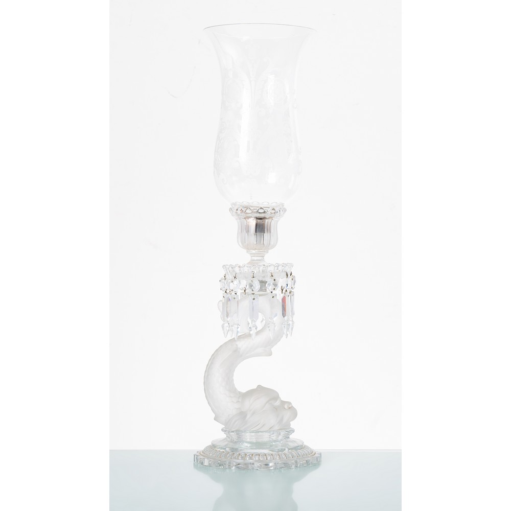 Lume in cristallo con base a guisa di delfino, boccia incisa (piccola sbeccatura alla base e nei pendenti).