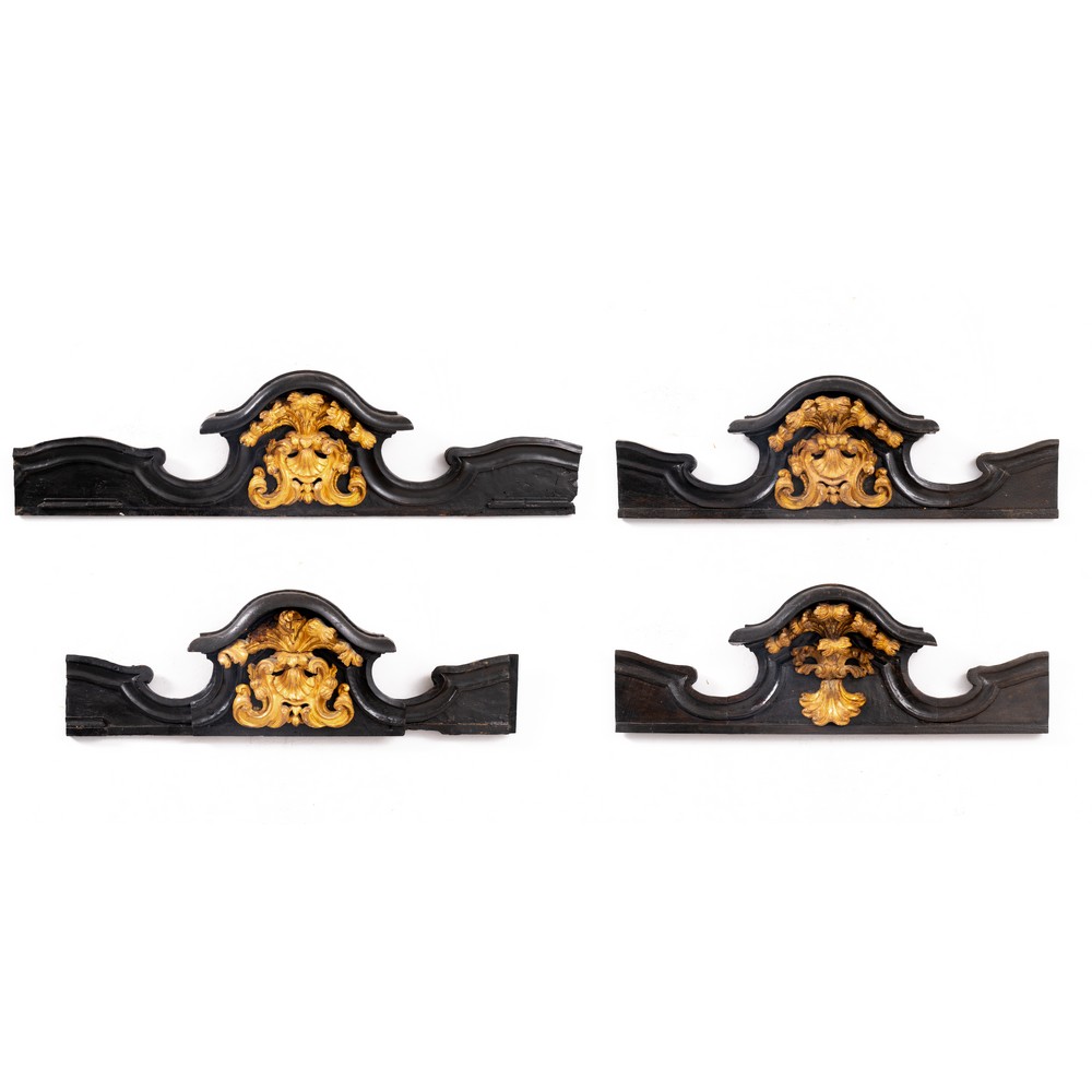 Quattro elementi in legno ebanizzato con fregi in legno dorato ad oro zecchino (usure e mancanze).
