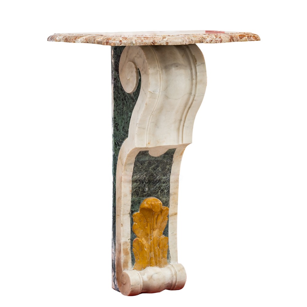 Mensola in marmo trasformata in piccola consolle, piano in marmo diaspro siciliano (mancanze).