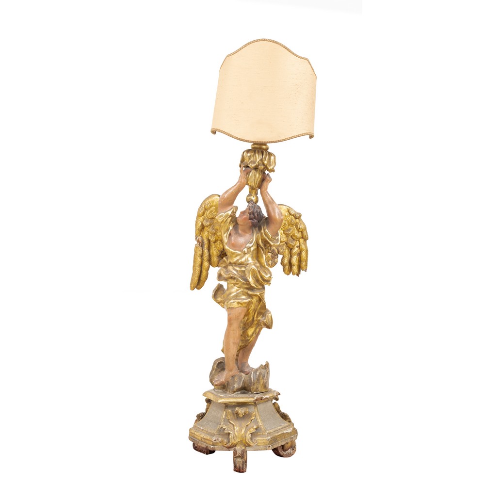 Torciere raffigurante "Angelo" in legno dorato ad argento a mecca e laccato (elettrificato).