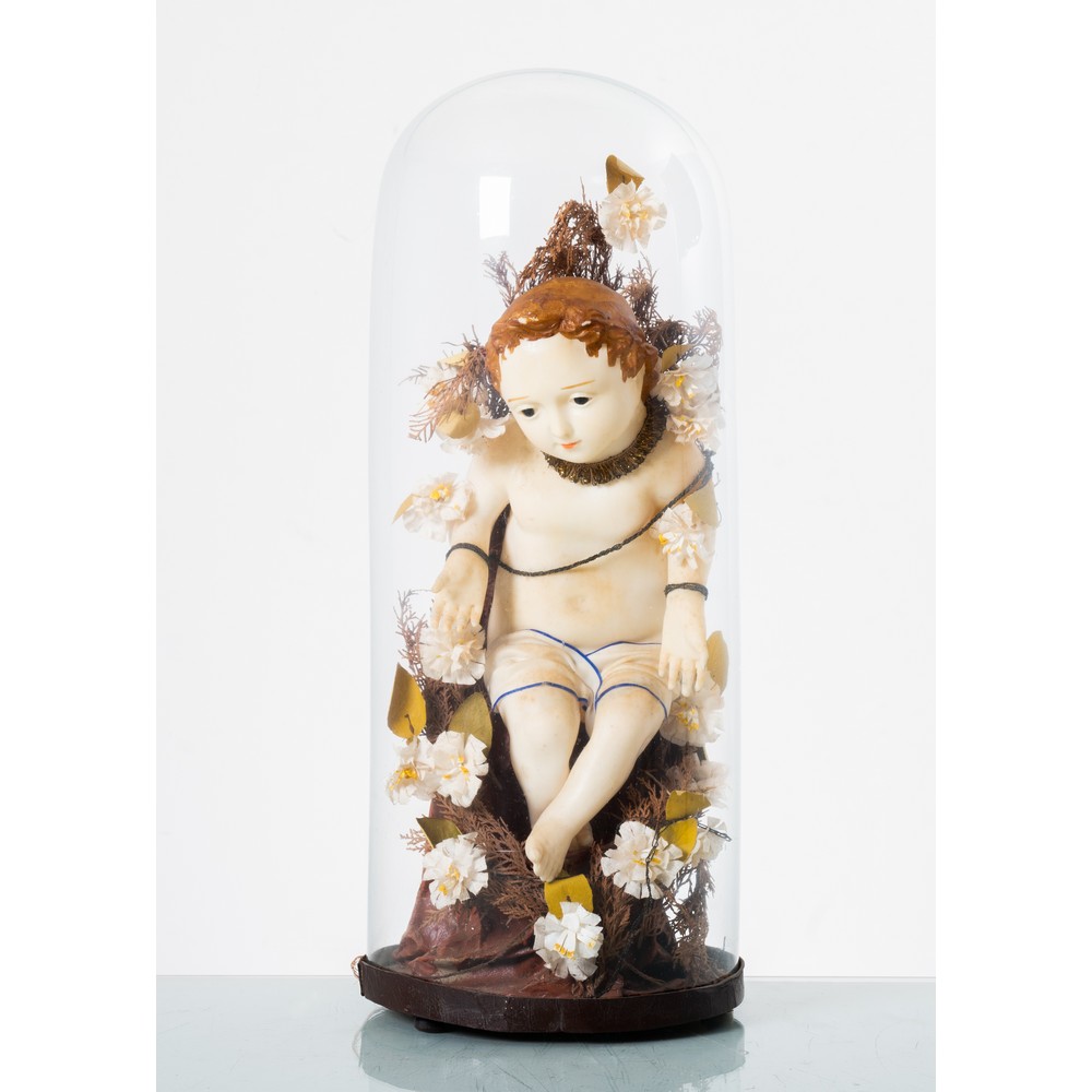 Bambinello in ceroplastica guarnito da fiori in stoffa entro campana in vetro.
