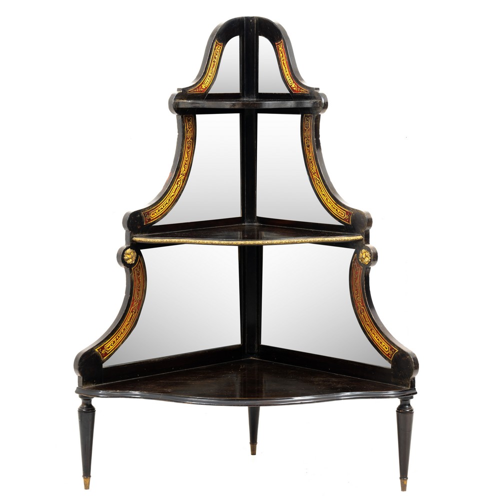 Angoliera boulle a tre ripiani in legno ebanizzato con tarsie in rame e fregi in bronzo (usure).