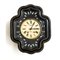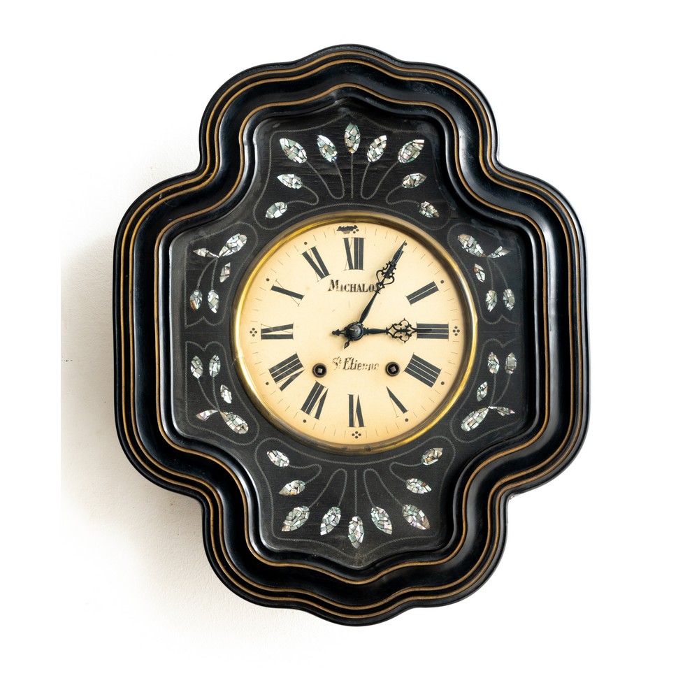 Orologio a occhio di bue in legno ebanizzato con tarsie in rame e madreperla, quadrante in vetro dipinto con numeri romani.