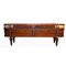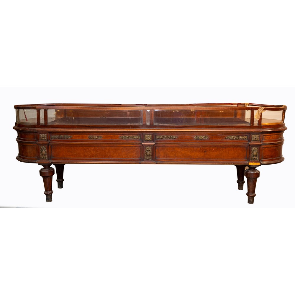 Bancone/espositore a fagiolo in piuma di mogano, parte superiore in vetro, cassetti e piani estraibili nella parte inferiore, guarnizioni decorative in bronzo (usure e mancanze)