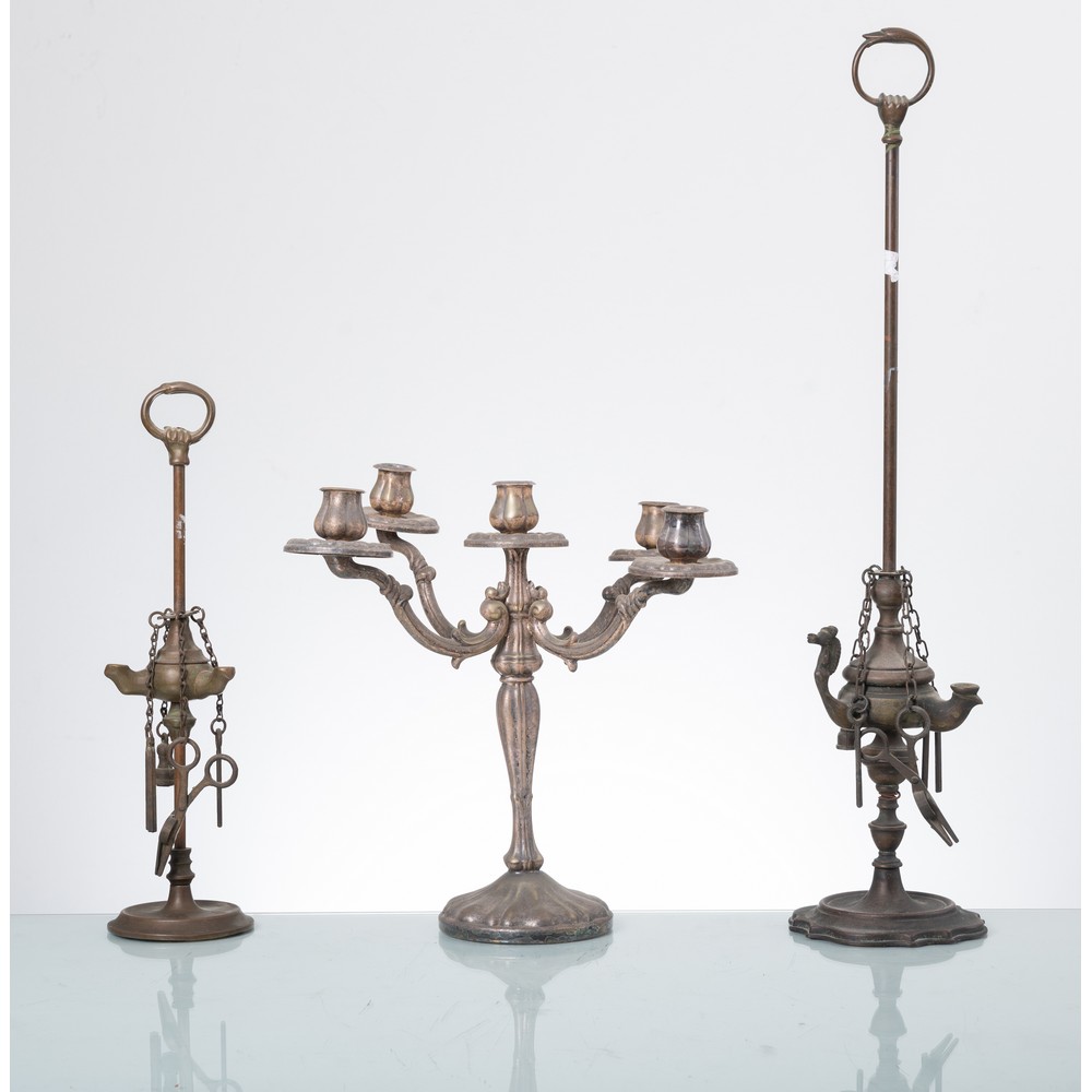Due lumiere in ottone ed un candelabro a cinque fiamme in metallo argentato.