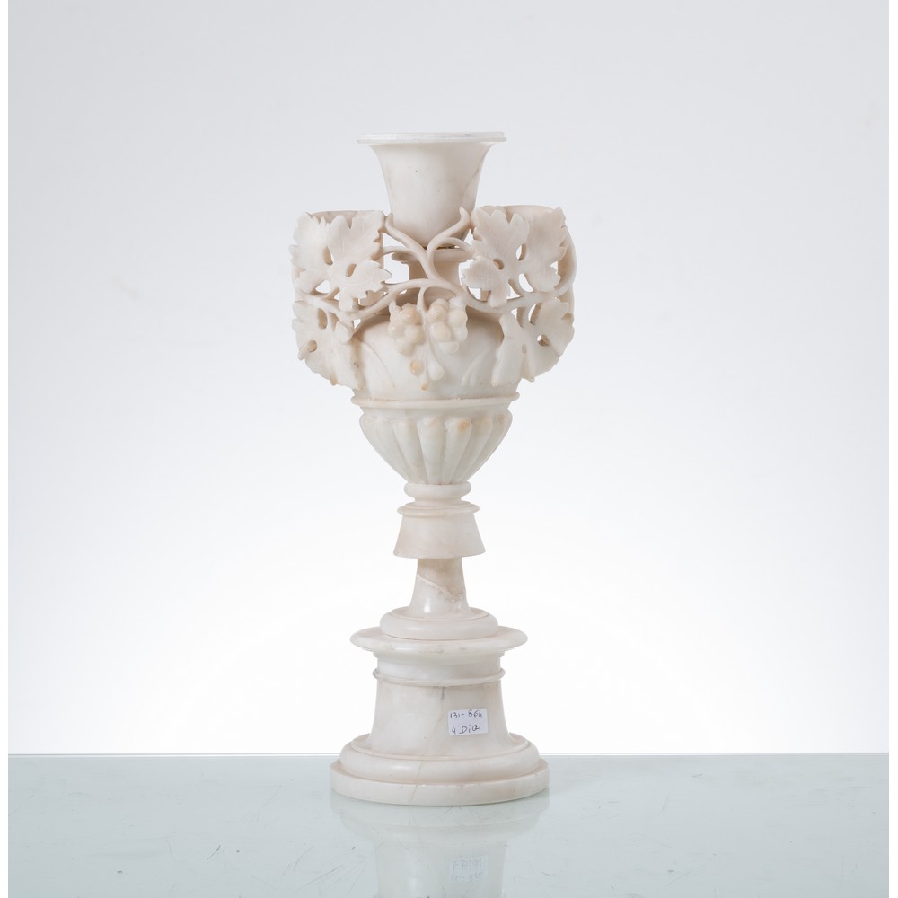 Fioriera in ceramica smaltata, vaso in vetro con decori in oro, vaso in porcellana con decori e lumeggiature in oro raffigurante "Figure orientali" e vaso in alabastro scolpito con foglie e grappoli d'uva.