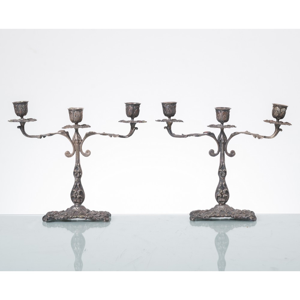 COPPIA DI CANDELABRI a due fiamme in metallo argentato riccamente cesellati.