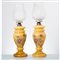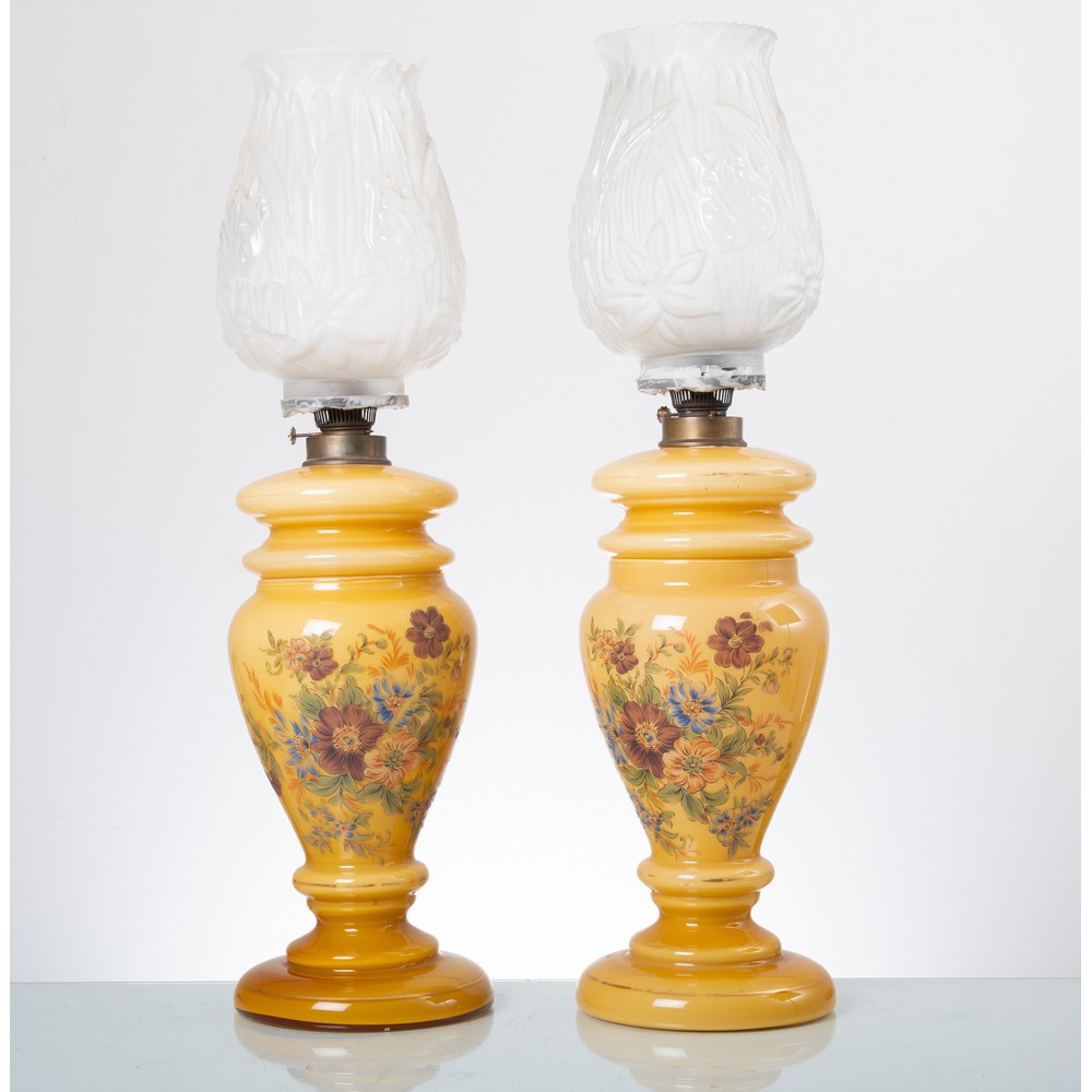 COPPIA DI LUMI a petrolio in opaline decorati a motivo floreale con bocce in vetro (una boccia rotta e un tubo mancante).