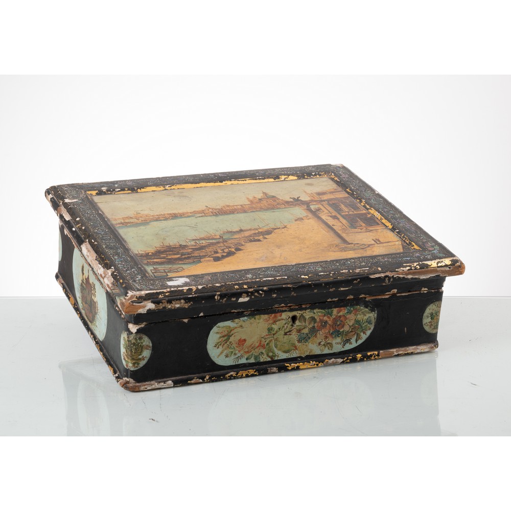 Scatola arte povera in legno laccato, decorato e stampigliato con tarsie in madreperla, lumeggiature in oro raffigurante "Veduta della città di Venezia" (usure e mancanze).
