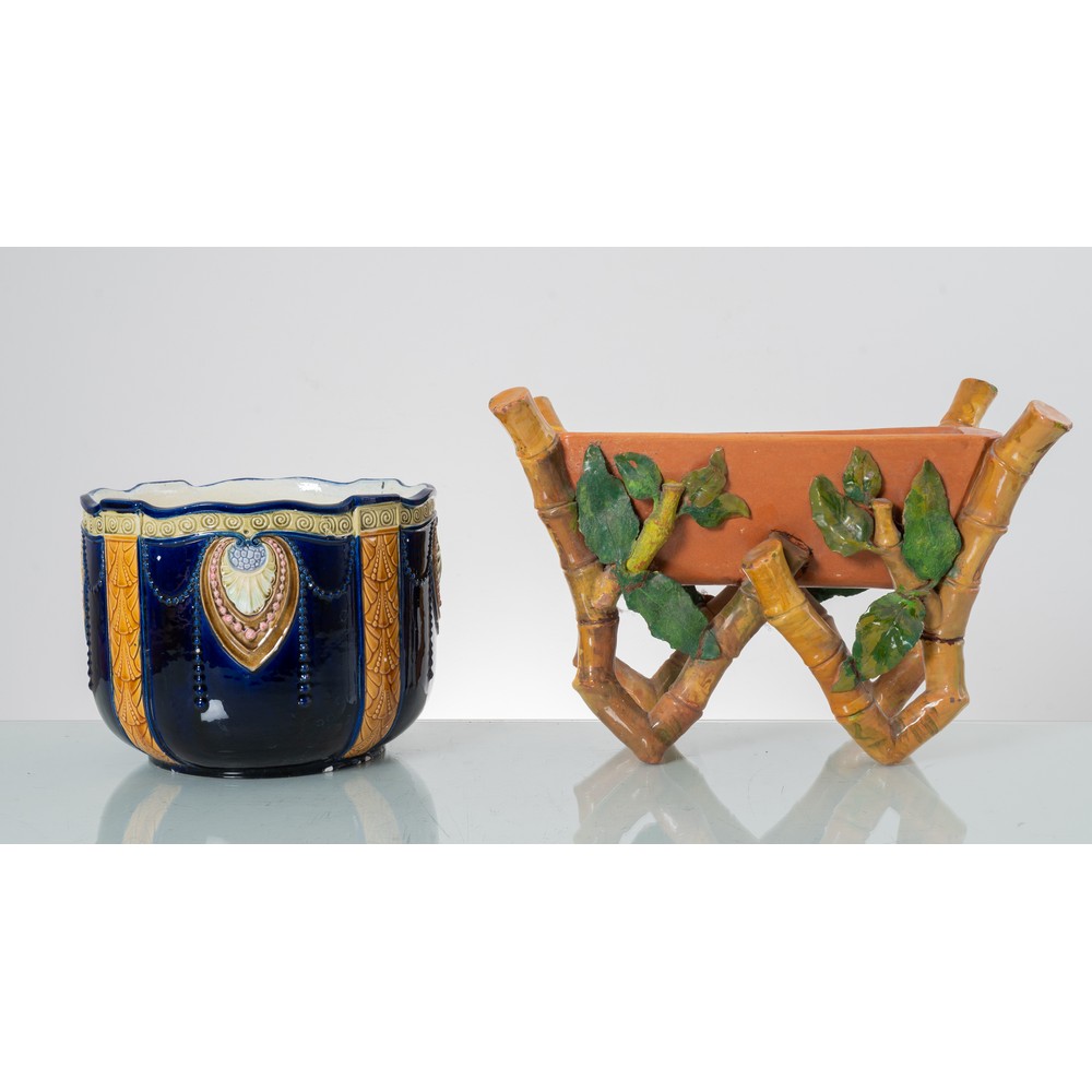 DUE CACHEPOT liberty in ceramica smaltata e decorata (filature e usure).