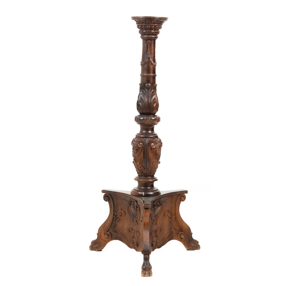 Torciere in legno di noce scolpito, piedi a zampa leonina (usure).