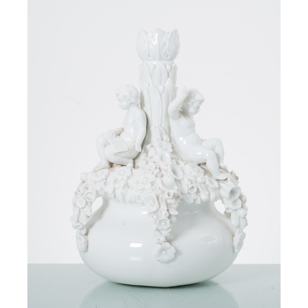 Centrotavola in porcellana bianca a motivo floreale con sculture raffiguranti "Putti".